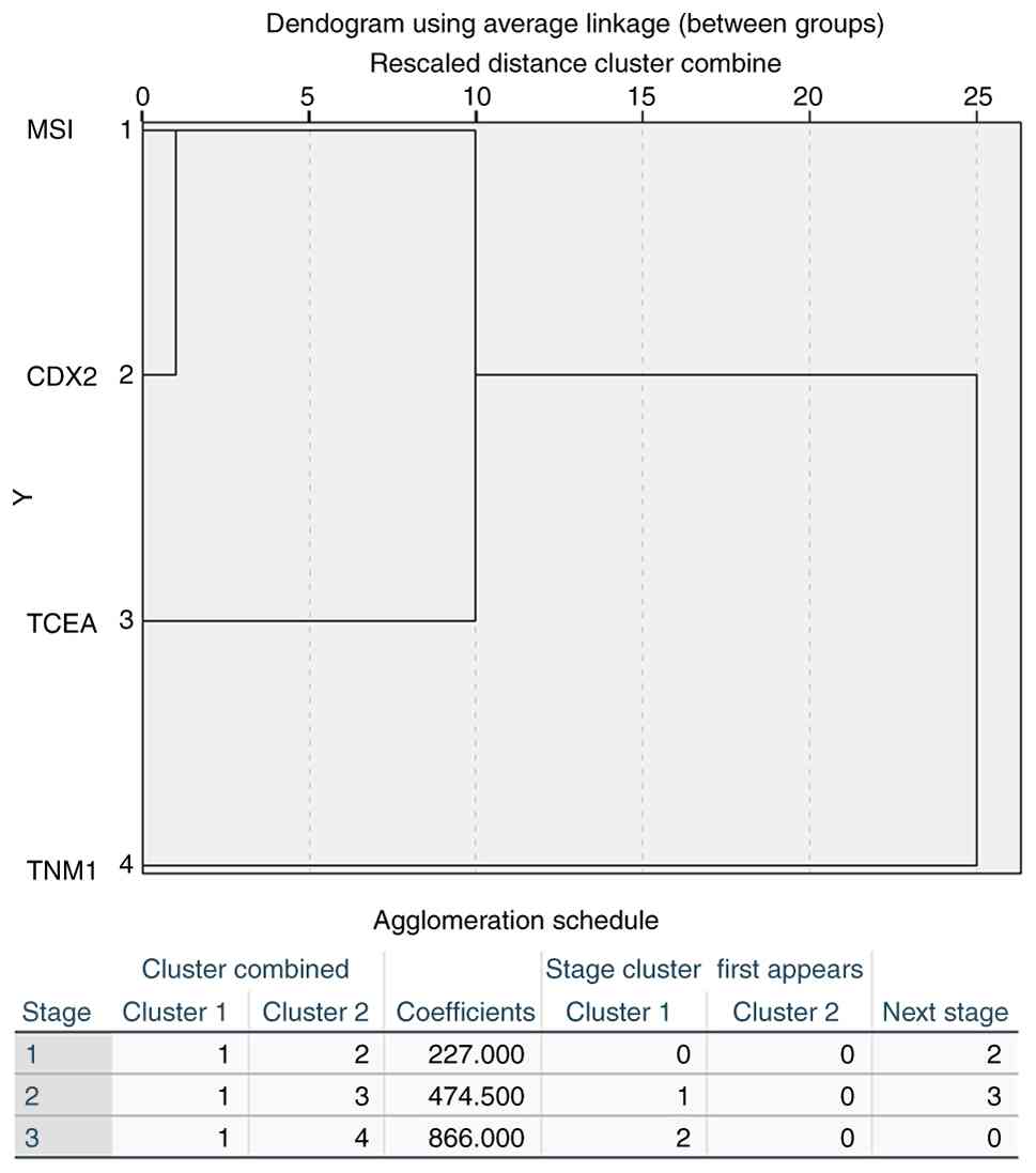 A systematic cluster analysis was conducted due to the correlations identified between the four variables analyzed. The results demonstrated that CDX2 clustered most closely with MSI (coefficient=258), followed by MSI with TCEA (coefficient=495), and finally MSI with TNM1 (coefficient=876). As illustrated in Fig. 3, CDX2 exhibited a high degree of similarity with MSI.
