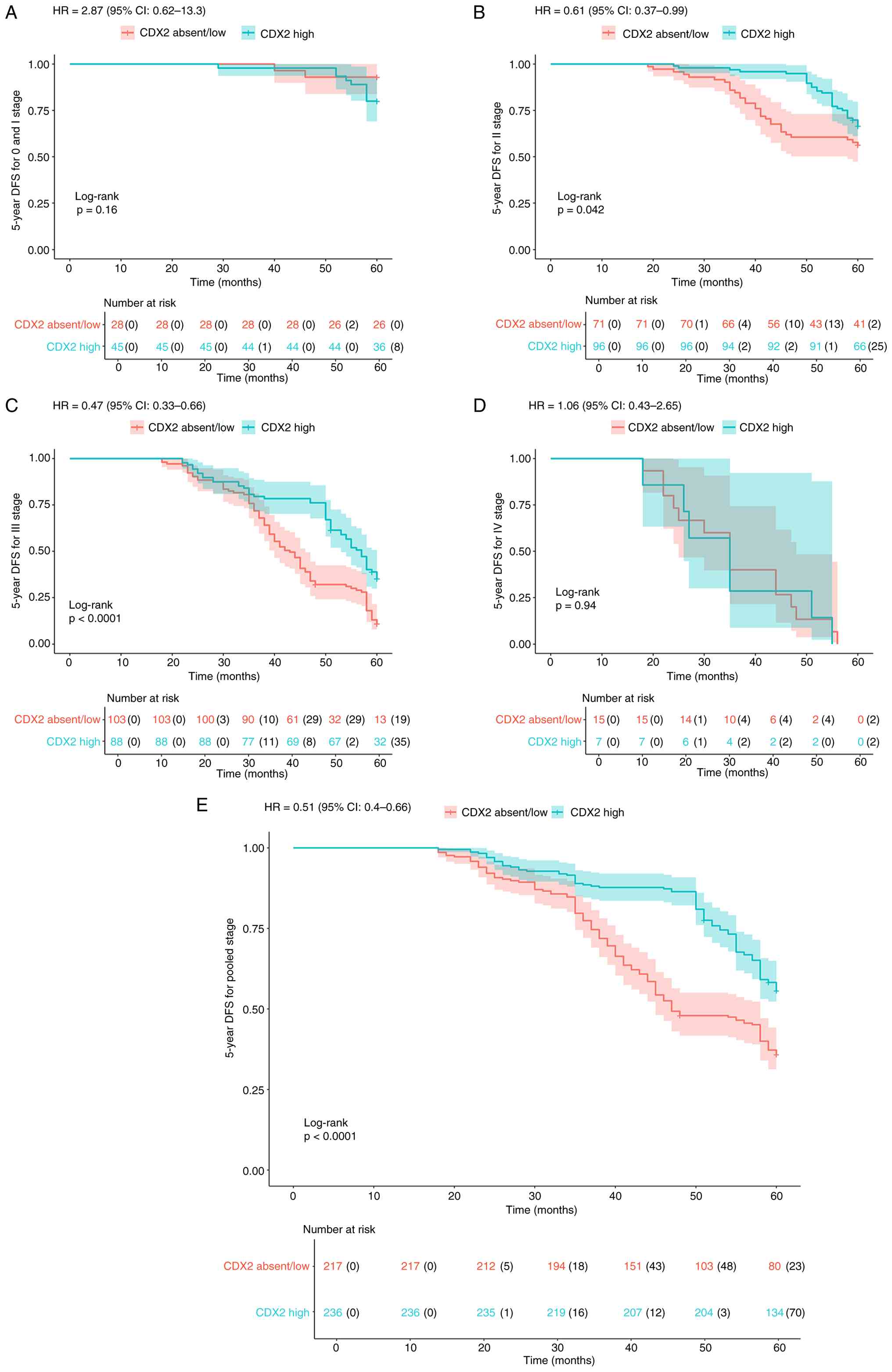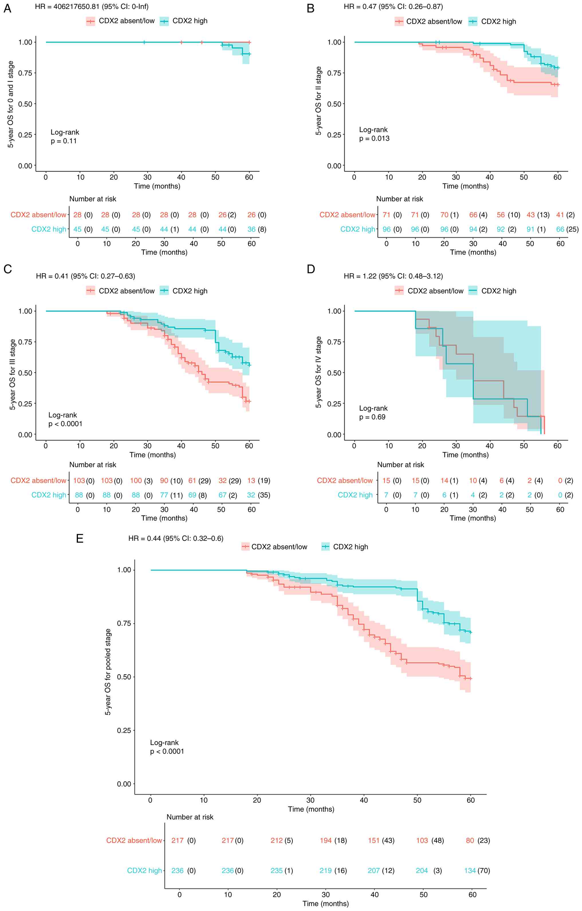 In conclusion, elevated CDX2 expression is associated with significantly improved OS and DFS in patients with stage II and III CRC, as well as in pooledstage analyses. CDX2 represents an independent prognostic biomarker in CRC. These findings, however, require validation in largescale, multi-centre prospective studies. Future research should focus on the following: i) Evaluating the combined prognostic utility of CDX2 with serum biomarkers such as CEA, CA199 and CA724; ii) assessing its synergistic effects with immunohistochemical markers including p53 status, MSI and Ecadherin expression; and iii) establishing standardised scoring systems for CDX2 expression.
