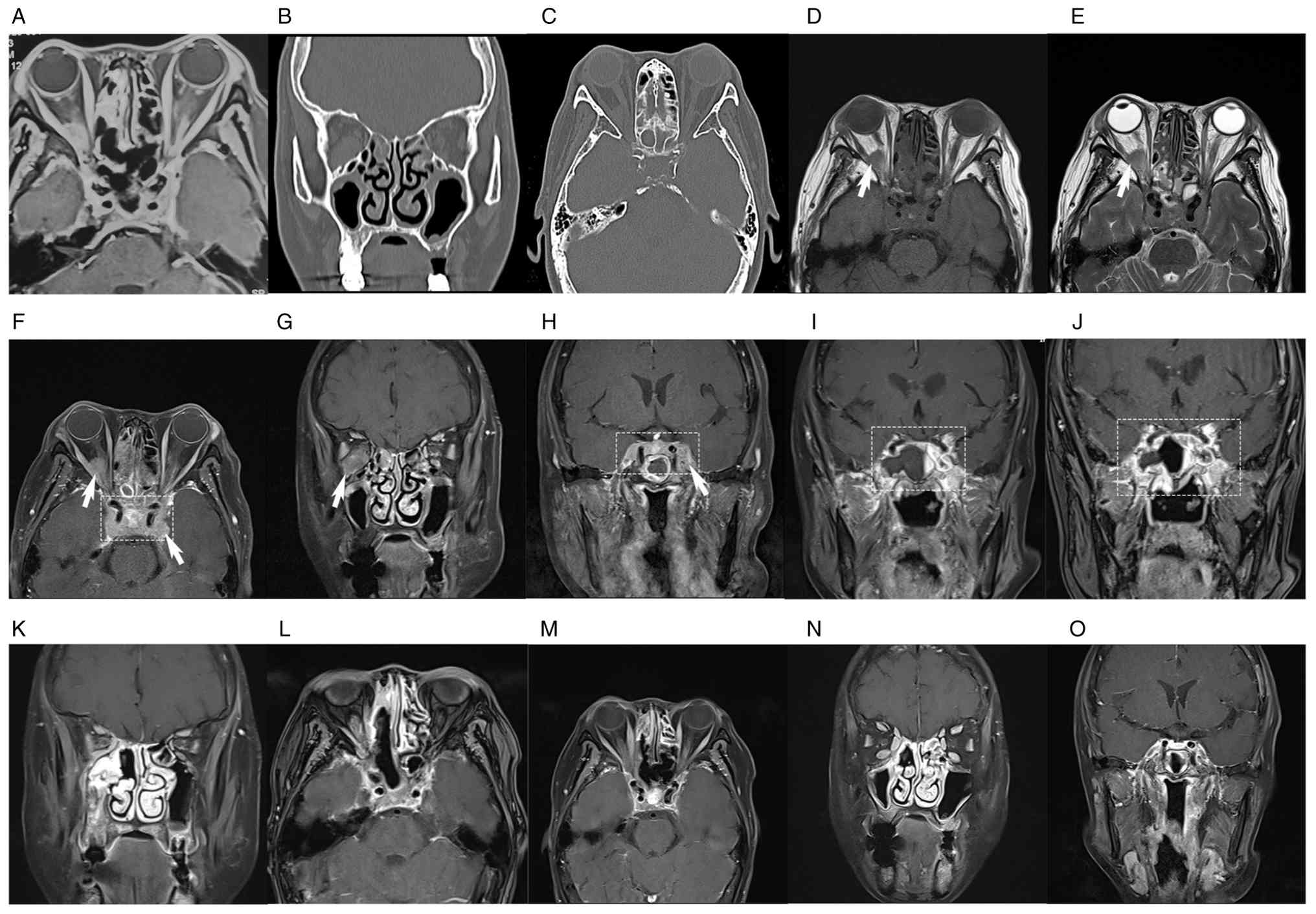 Routine cerebrospinal fluid (CSF) tests and biochemical indices were normal. CSF analyses, including ink staining, Gram staining, acid-fast staining, and bacterial and fungal cultures, were all negative. CSF pressure was 105 mm H2O (80–180 mmH2O), and no tumor cells were identified on CSF pathological examination. Orbital MRI revealed a 15.9×5.9 mm lesion at the right orbital apex, while contrast-enhanced MRI showed abnormal thickening and enhancement of bilateral CSs, extending to the adjacent dura mater and clivus (Fig. 1A). A CT scan of the skull base, orbit and sinuses showed no bony destruction and adjacent hyperostosis (Fig. 1B and C). An idiopathic orbital inflammatory pseudotumor was initially suspected, and intravenous methylprednisolone pulse therapy was initiated (120 mg on days 1–3 and 80 mg on days 4–6) but was discontinued due to severe gastrointestinal symptoms. The ptosis and complete external ophthalmoplegia of the left eye showed no improvement. Over the subsequent week, the patient developed complete bilateral external ophthalmoplegia, severe bilateral blepharoptosis completely covering the pupils, and bilateral fixed and dilated pupils (OD, 5 mm; OS, 6mm). Follow-up MRI revealed multifocal abnormal enhancement in multiple areas, including the bilateral CSs, right orbital compartment, sinonasal cavities, clivus and marrow cavity of the left pterygoid process (Fig. 1D-H).