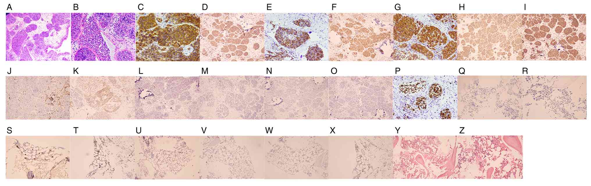 Based on these findings, the patient was ultimately diagnosed with IVLBCL of non-germinal center B-cell (non-GCB) phenotype. Minimal residual disease assessment was negative. Fluorescence in situ hybridization and cytogenetic studies were not performed due to the patient's refusal. Bone marrow biopsy showed mild marrow hypercellularity, a normal myeloid-to-erythroid ratio and identifiable megakaryocytes, with no definitive tumor cells identified. Immunohistochemical staining of bone marrow smears was negative for CD20 and EBER, but positive for CD61, MPO and Ki-67; occasional scattered CD3-, CD34- and CD117-positive cells were also noted (Fig. 2Q-Z). The results for MPO are not shown but are based on the pathology report.
