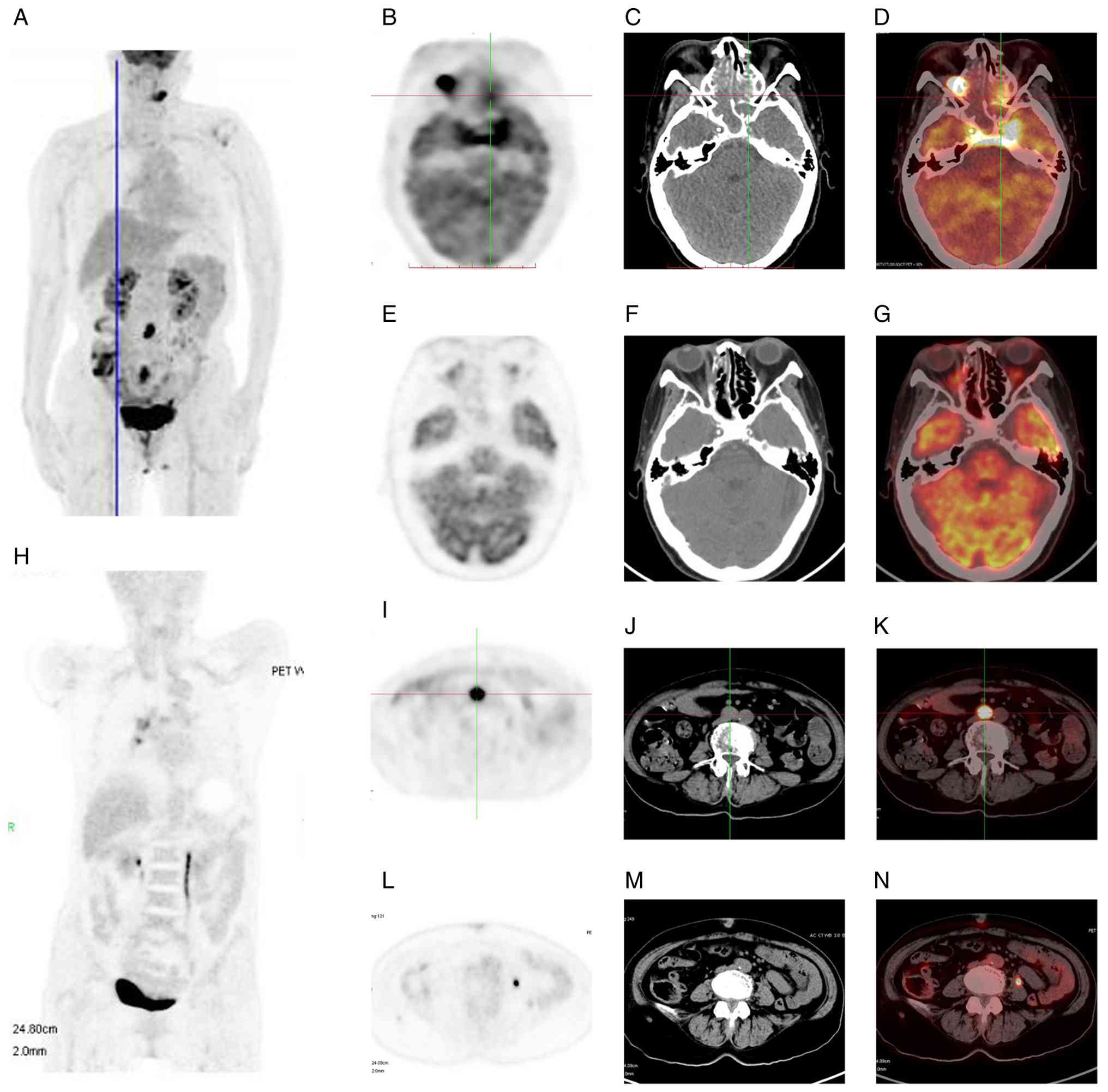 Positron emission tomography-computed tomography (PET-CT) subsequently revealed multiple lesions with abnormally increased fluorodeoxyglucose (FDG) uptake, involving the ethmoid sinus, sphenoid sinus, bilateral CSs, right orbital mass, periaortic and pelvic lymph nodes, sacral spinal canal and left mandibular medullary cavity (Fig. 3A, C-E and I-K). The right orbital apex and periaortic lymphadenopathy showed the highest FDG uptake, with the maximum standardized uptake value (SUVmax) of 11.72 and 12.77, respectively. SUVmax values for the sphenoid sinus, bilateral CSs, sacral spinal canal and left mandibular medullary cavity were 6.31, 9.37, 8.69 and 8.57, respectively.