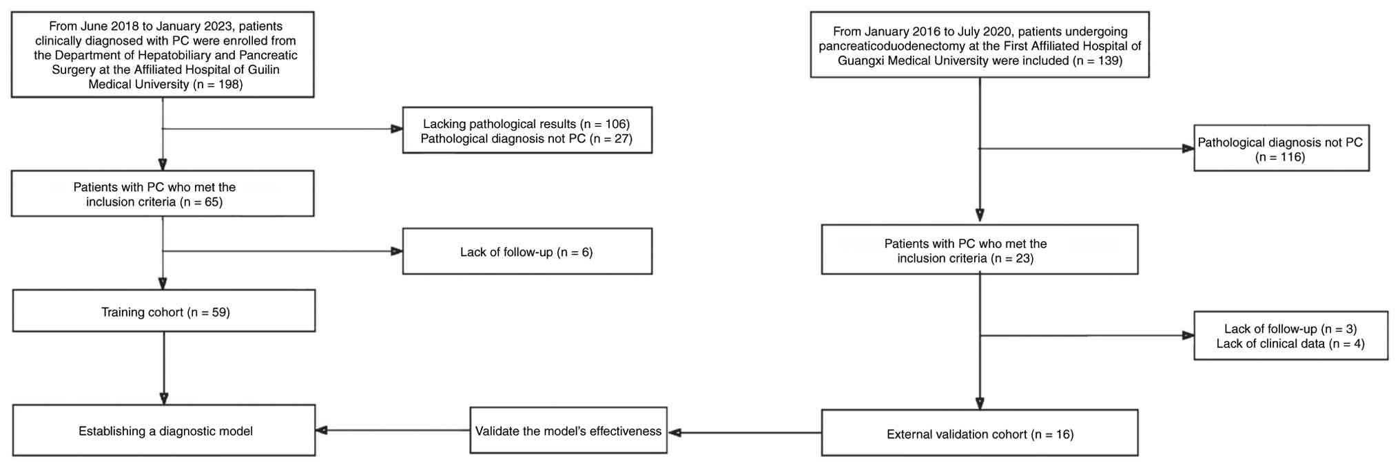 According to the inclusion and exclusion criteria, 59 patients with PC treated at the Department of Hepatobiliary and Pancreatic Surgery of the Affiliated Hospital of Guilin Medical University (Guilin, China), including 28 males and 31 females with a median age of 58 years (range, 33–86 years), were continuously included in the training cohort between June 2018 and January 2023. Additionally, 16 patients with PC treated at the Department of Hepatobiliary and Pancreatic Surgery of the First Affiliated Hospital of Guangxi Medical University (Nanning, China) between January 2016 and June 2020, comprising 8 males and 8 females with a median age of 61.5 years (range, 39–71 years), who met the inclusion and exclusion criteria, were included in the external validation cohort (Fig. 1). There were no significant differences in terms of age and gender distribution between the training group and the validation group. All of the cases were recruited as consecutive cases based on the inclusion and exclusion criteria. PC was diagnosed based on tumor pathology and LM was finally diagnosed by imaging tests, pathological findings and follow-up results.