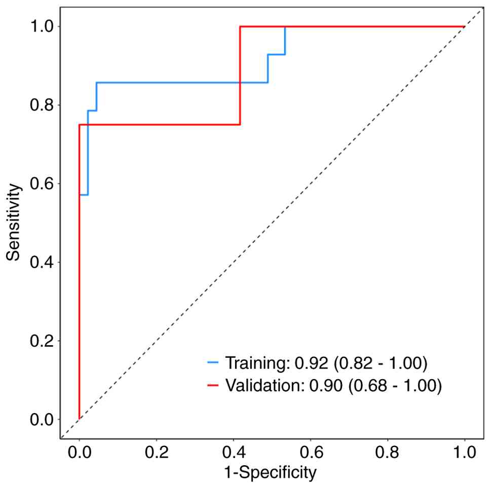 Based on the results of the multivariate logistic regression analysis, a diagnostic model integrating four blood biochemical indicators for diagnosing SLM in patients with PC was established as follows: Logit(P)=0.05 × (CEA, ng/ml) + 0.17 × (CA153, U/ml) + 0.54 × (WBC, × 109/l) + 0.01 × (PLT, ×109/l)-12.07. In the training cohort, the AUC of the model was 0.92 (95% CI: 0.82–1.00), and sensitivity and specificity were 0.96 and 0.86, respectively. The AUC of the model was 0.90 (95% CI: 0.68–1.00), and the sensitivity and specificities were 0.83 and 0.75, respectively, in the external validation cohort. These results are summarized in Fig. 2 and Table IV. The optimal cut-off value for the diagnostic score was determined using the Youden index.