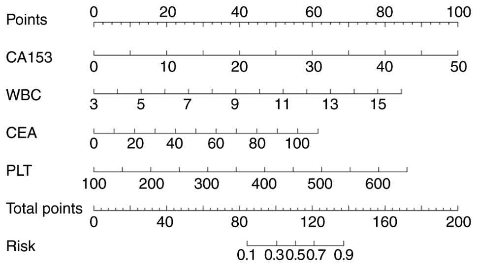 To ascertain the value of these factors more intuitively and understand the significance of these independent risk factors more quickly and easily in clinical practice, a nomogram for LM in patients with PC was constructed using R software (Fig. 3). This nomogram provides a visual tool to facilitate the practical application of the diagnostic model, allowing clinicians to estimate the probability of LM based on the CEA values, CA153, WBC and PLT. For instance, a patient with CEA=7.3 ng/ml, CA153=15.6 U/ml, WBC=9.4×109/l and PLT=623×109/l would have a total point score of ~2.253, corresponding to a predicted probability of LM of ~0.927.