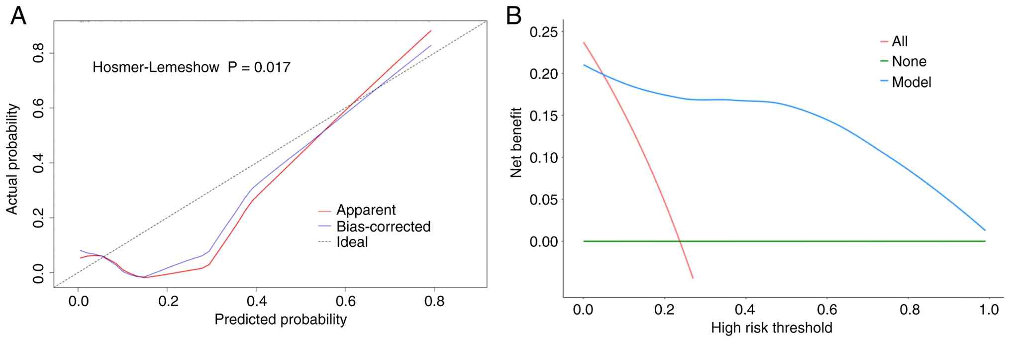 The model's goodness of fit was evaluated using the HL test, which yielded a P-value of 0.017. Given the relatively small sample size, the calibration was also assessed using bootstrap resampling (1,000 replicates). The calibration curve (Fig. 4A) shows a good agreement between predicted and observed probabilities, with a mean absolute error of 0.067, indicating acceptable calibration.