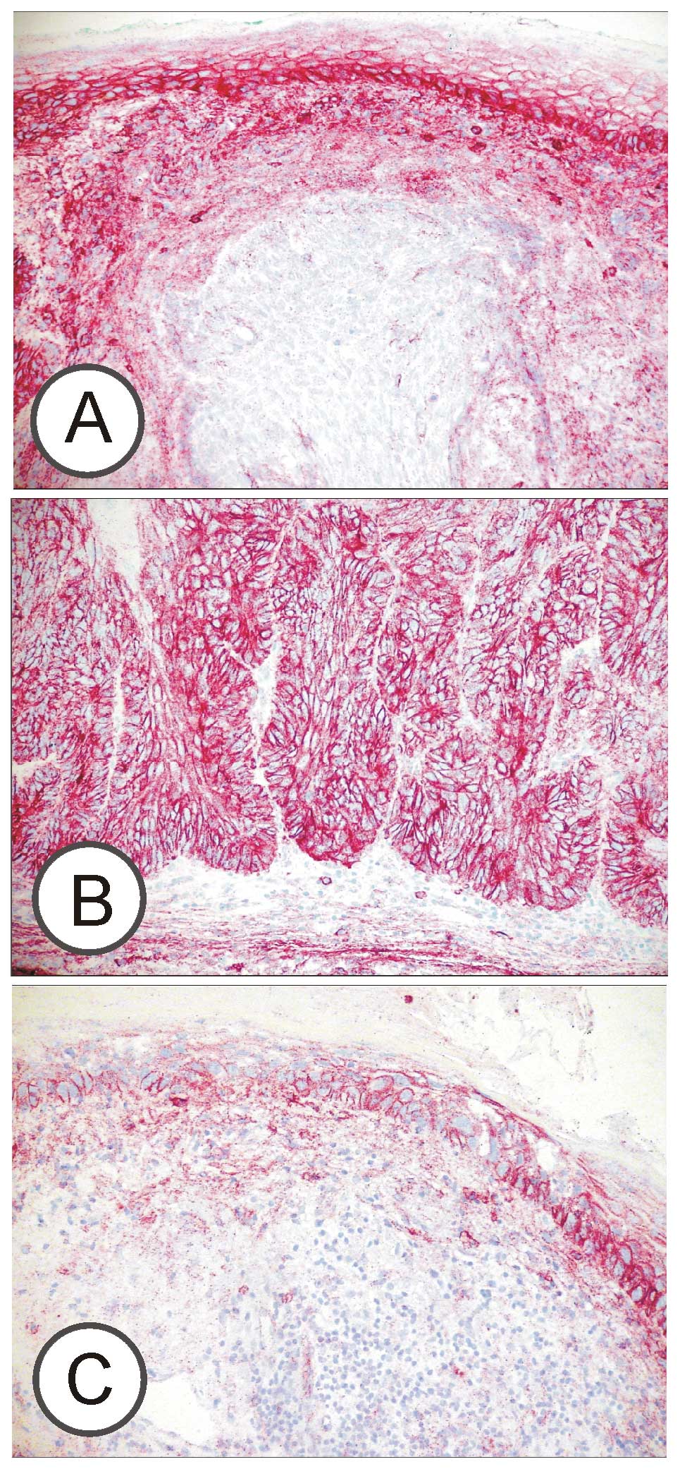 Tetraspanins are potentially useful molecular markers that differentiate between tumour classes and subtypes, since members of this protein family were often found to be altered during malignant conversion and tumour progression. In this study, we analysed expression of the tetraspanin CD9 in the frequent cutaneous neoplasms basal cell carcinoma (BCC), squamous cell carcinoma (SCC) and actinic keratosis (AK), which is considered a precursor lesion (carcinoma in situ) from which an invasive SCC can develop. A moderate to strong CD9-specific staining of the tumour cells' plasma membranes was uniquely observed in all BCCs, SCCs and AKs. All SCCs showed additional intracellular CD9 which was rarely (20%) seen in AKs. Semi-quantitative assessment of CD9 present in the plasma membranes of tumour cells of BCCs (mean staining intensity 1.91) and SCCs (3.64) reflected the different CD9 expression of normal precursor cells from which these tumours most likely originate. Although considered an intermediate stage in the development of SCCs, AKs did not show intense staining of the plasma membranes typical of normal keratinocytes or invasive SCCs (p=0.011) but only moderate intensity (mean 1.63). In BCCs, significantly (p=0.0005, n=56) stronger CD9-specific immunoreactivity was seen in the inner regions of the tumours than at their sites of expansion. In summary, our results point to an important role of CD9 at the front of tumour expansion in BCCs and SCCs, and in the pathogenesis of invasive SCCs.