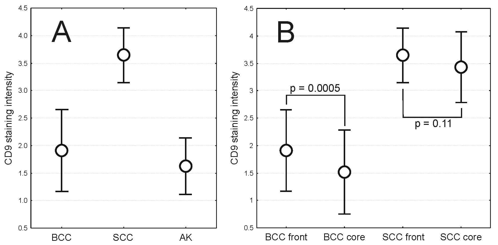 Differential expression of tetraspanin CD9 in basal cell and squamous cell carcinomas of the skin and actinic keratosis