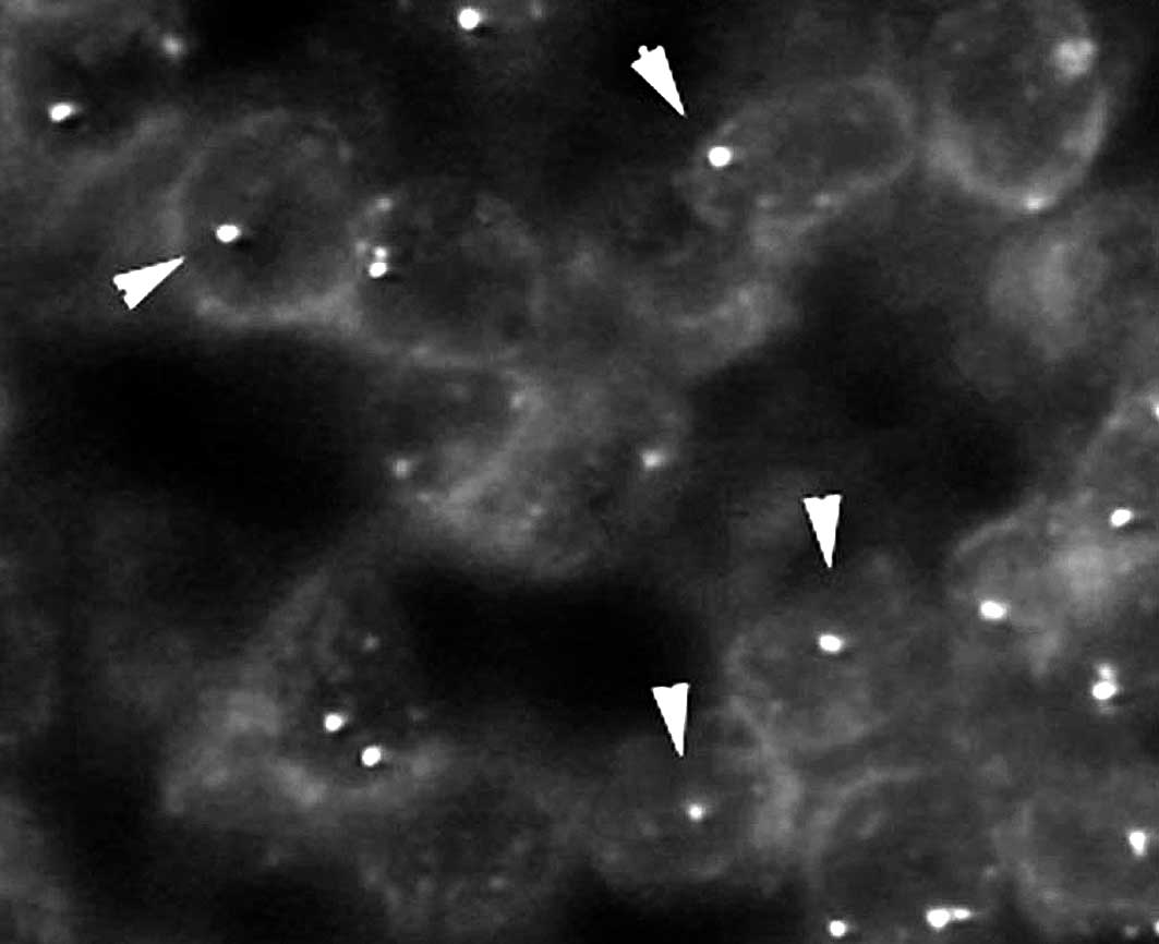 The results of the FISH analysis are summarized in Table II. Tumorous cells of cases 1, 2 and 3 exhibited monosomy of chromosome 3 (Fig. 2), but one tumor (case 4) showed disomy of chromosome 3. In case 1, neoplastic cells demonstrated a monosomy of chromosome 13, but tumorous cells in cases 2, 3 and 4 showed a disomy of chromosome 13.