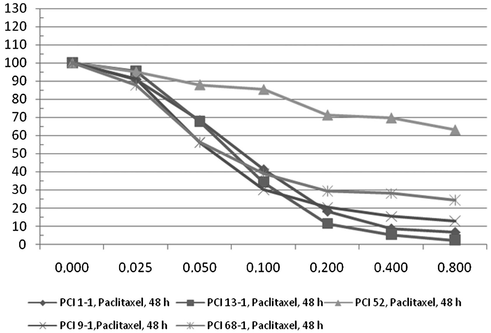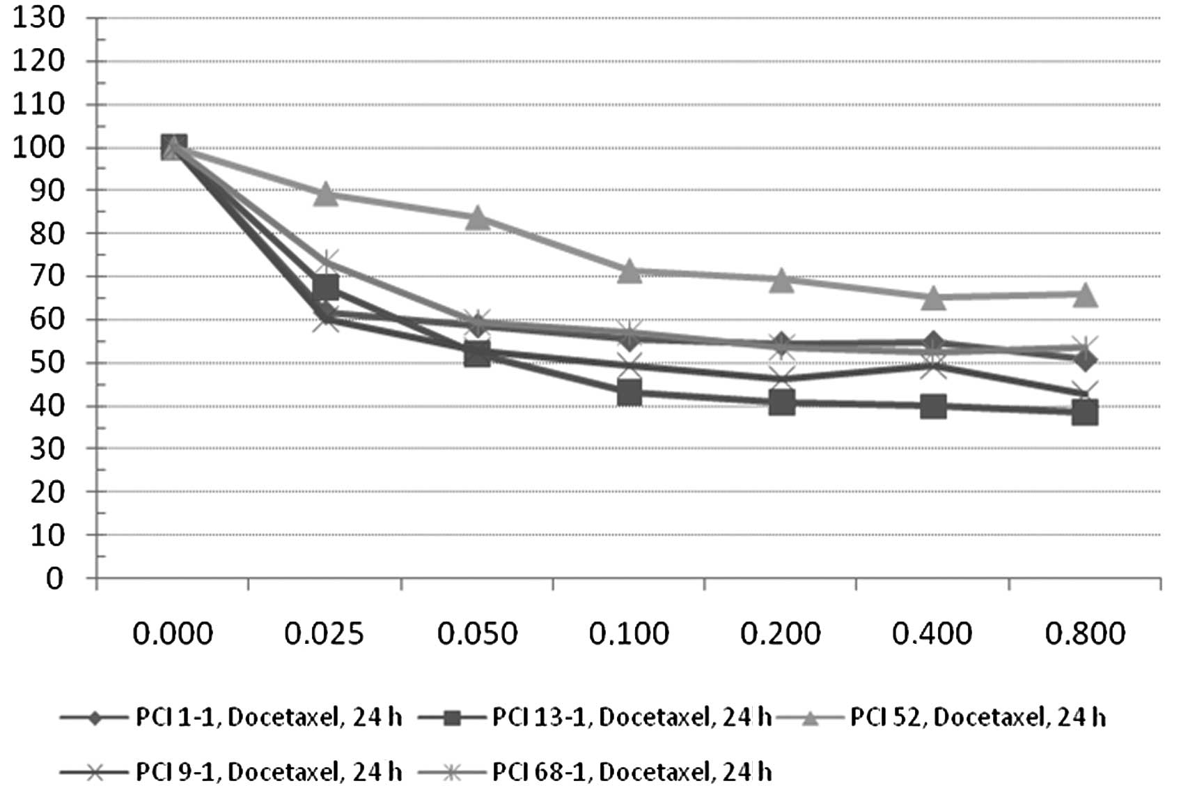 The Deltas for 0.8 μM docetaxel and 24 h were: PCI 68-1, 46.55; PCI 1-1, 49.37; PCI 9-1, 57.29 and PCI 13-1, 61.66 (Fig. 1). After 48 h of docetaxel incubation, the Deltas were: PCI 68-1, 81.56; PCI 1-1, 85.24; PCI 9-1, 86.33 and PCI 13-1, 96.92 (Fig. 2).