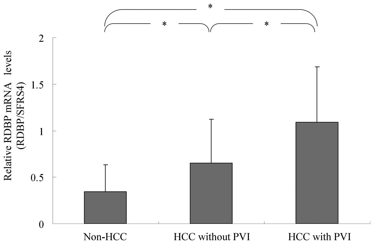 Using pooled DNA array data, we identified 40 genes demonstrating expression levels that were higher by >4-fold in HCC tissues when compared with non-cancer liver tissues. We next filtered 18 genes for which expression levels were significantly higher in HCC with PVI than in HCC without PVI. We subsequently ranked the 18 genes according to the magnitude of their mRNA levels and then examined immunohistochemically their protein levels in several sample sets of HCC and corresponding non-HCC liver tissues. Our preliminary examination demonstrated that RDBP expression levels were abundant in HCC tissues and were significantly higher in HCC with PVI than in HCC without PVI.