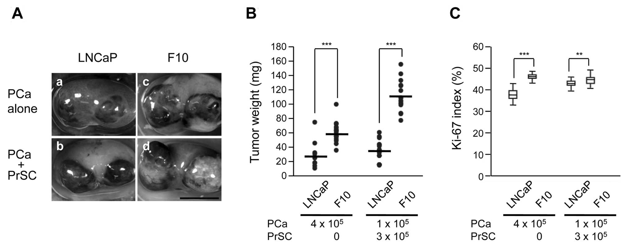 The tumorigenicity of LNCaP-F10 cells was compared to that of the parental LNCaP cell line. When the cells were implanted into the renal subcapsular space, the weight of LNCaP-F10 tumors with or without prostate stromal cell (PrSC) stimulation was significantly greater compared to that of the parental LNCaP tumors (Fig. 5A and B). Cell proliferation (Ki-67 labeling index) in LNCaP-F10-derived tumors was also increased compared to that of the parental LNCaP tumors (Fig. 5C).