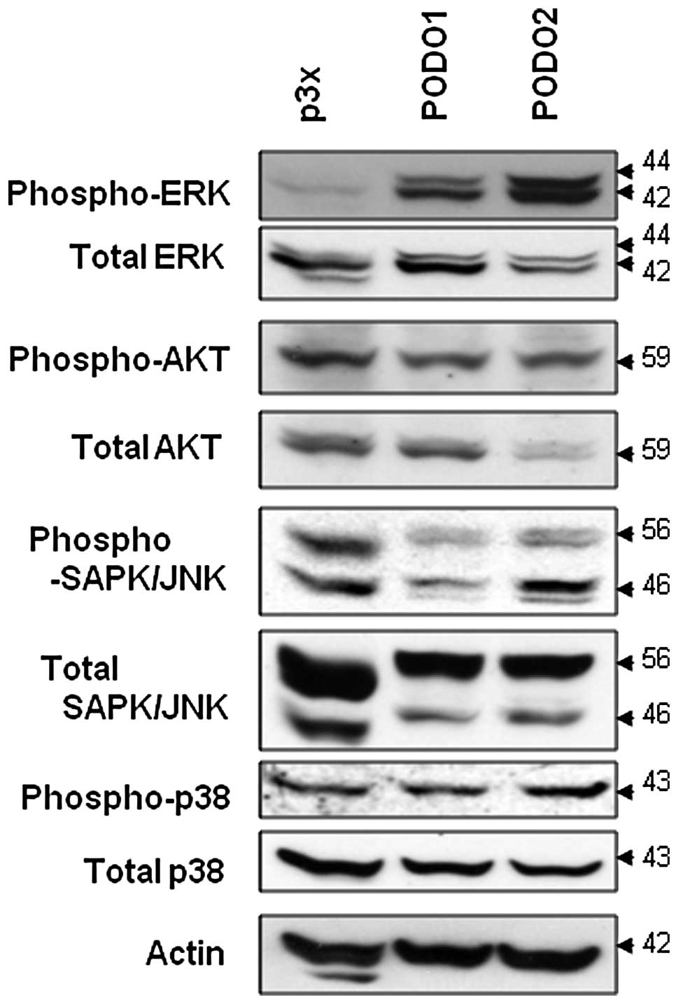 To identify the molecular mechanism responsible for the anti-apoptotic effect of podoplanin overexpression in mesothelioma cells, we examined the activation of the ERK signaling pathway. The phosphorylation levels of JNK, p38 and AKT did not differ between PODO1 and PODO2 compared with p3× cells (Fig. 6). In contrast, the phosphorylation level of ERK was dramatically enhanced in the two podoplanin transfectants. Thus, podoplanin-induced ERK activation may be inhibited by starvation-induced apoptosis in mesothelioma cells.