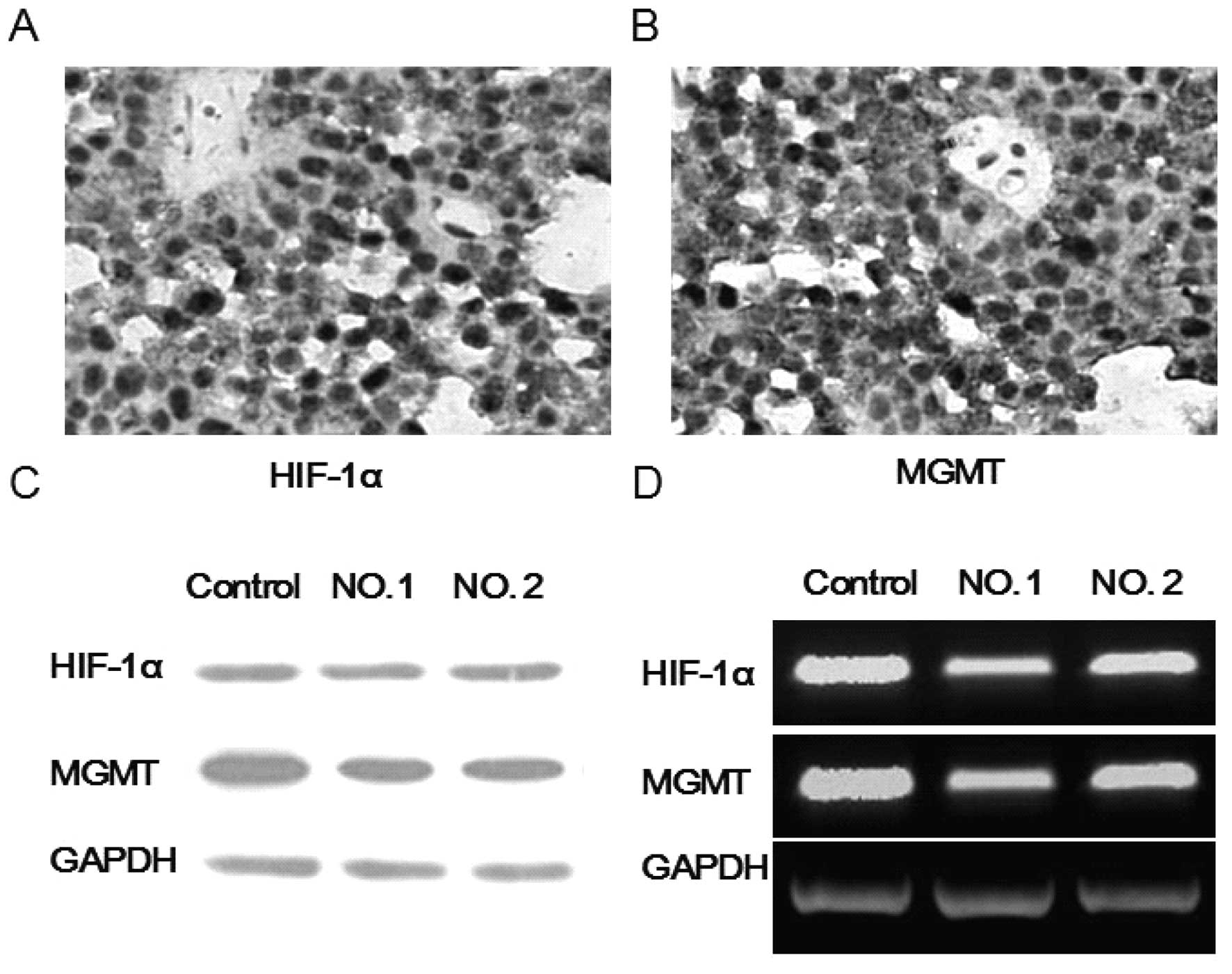 All the procedures and reagents employed in the present study are described in our previous reports (11,13,14). Cell viability assay was carried out using Cell Counting Kit-8 (Boster Biological Technology). The following primers for RT-PCR were used: human HIF-1α F, GCAAGACTTTCCTCAGTCGACACA and R, GCATCC TGTACTGTCCTGTGGTGA; human MGMT F, ATGGAT GTTTGAGCGACACA and R, ATAGAGCAAGGGCAG CGTTA; human GAPDH F, ACGGATTTGGTCGTATTGGG and R, TGATTTTGGAGGGATGTCGC. The primary antibodies used include anti-HIF-1α (1:1,000; Cell Signaling Technology), anti-MGMT (1:1,000; Santa Cruz Biotechnology), anti-PCNA (1:2,000; Santa Cruz Biotechnology), anti-Rad51 (1:1,000; Santa Cruz Biotechnology) and anti-GAPDH (1:3,000; Santa Cruz Biotechnology).