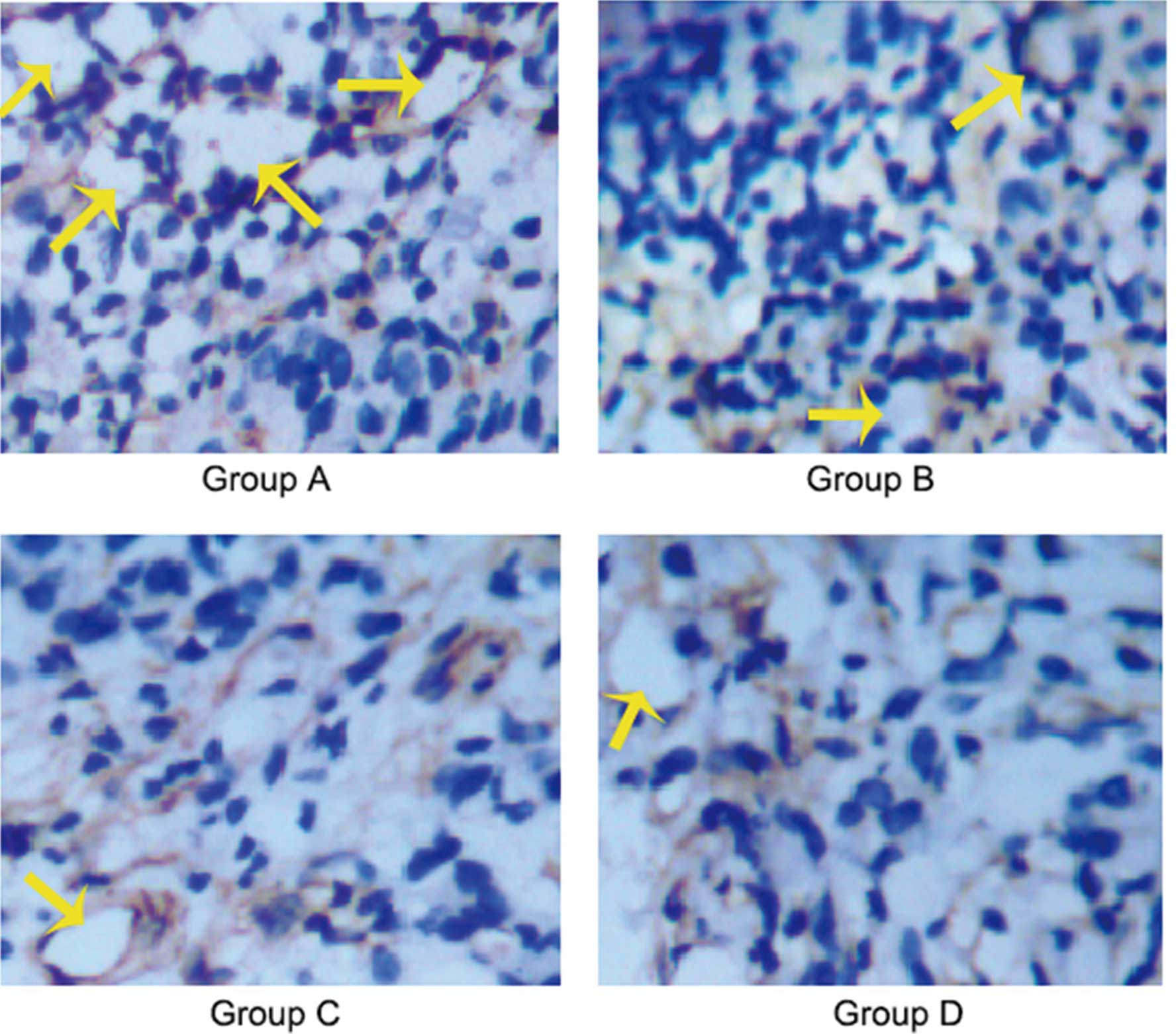 Immunohistochemical staining assays demonstrated that there was a significantly different expression of D2–40 between control group and treatment groups, with the highest level of expression for D2–40 being found in the control group with normal saline (group A) and the lowest in the treatment group with ROSI at 100 mg/kg/2 days (group D). The typically D2–40-positive vessels (lymphatic vessels) in the control group were evidently more than those in the treatment group. These outcomes indicated that ROSI inhibited the lymphangiogenesis of human gastric cancer transplanted in nude mice in a dose-dependent manner. The representative microscopic view of the immunohistochemical staining for LVD using D2–40 antibody in nude mice treated with normal saline and different ROSI dose at a magnification of ×400 is illustrated in Fig. 3, and the average value of D2–40-positive vessels in 5 hot spot areas at ×200 magnifications (LVD) is summarized in Table II.