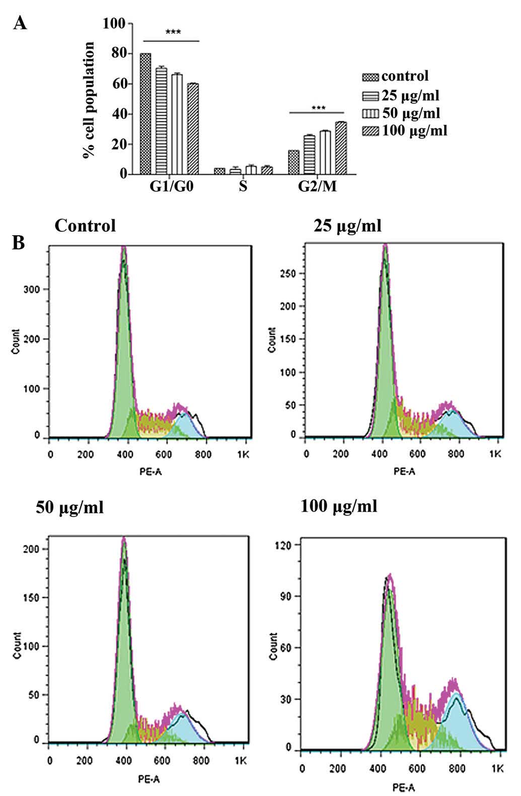 DNA histograms showed that an active fraction containing liquiritin, isoliquiritin and isoliquiritigenin increased the population of G2/M cells in a concentration-dependent manner at 24 h (Fig. 12).