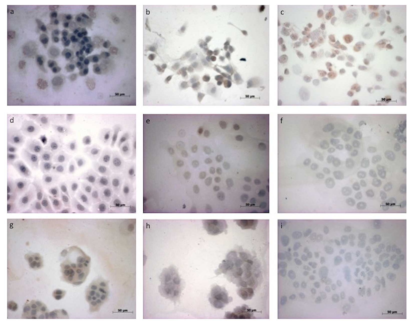 Immunhistochemical studies for MMP-14 illustrated that all tumour cell lines, irrespective of HPV status, expressed similarly moderate levels of MMP-14 compared to the chemonaive controls. We detected decreased reactivity with rising concentration of imatinib and with increasing time of incubation from 48 to 240 h in the HNSCC14C, HNSCC11A and CERV196 cells. Notably, we detected strong immunostaining for MMP-14 in the p16-positive SCC line (CERV196) only after 48 h of imatinib (18 μmol/ml) treatment (Table I). Compared to the differences in dose escalation, we showed stronger immunostaining for MMP-14 in all incubated SCC cell lines after incubation with imatinib at a lower concentration of 18 μmol/ml (Table I). However, after treatment with 5-FU in the CERV196 cells, we found slightly increased reactivity for MMP-14 only after 72 h. In contrast, the immunohistochemical studies against MMP-14 showed slightly increased reactivity for MMP-14 only after 240 h of 5-FU treatment in the HNSCC11A cells. In HNSCC14C, we detected no positive reactivity for MMP-14 (Fig. 1; Table I).