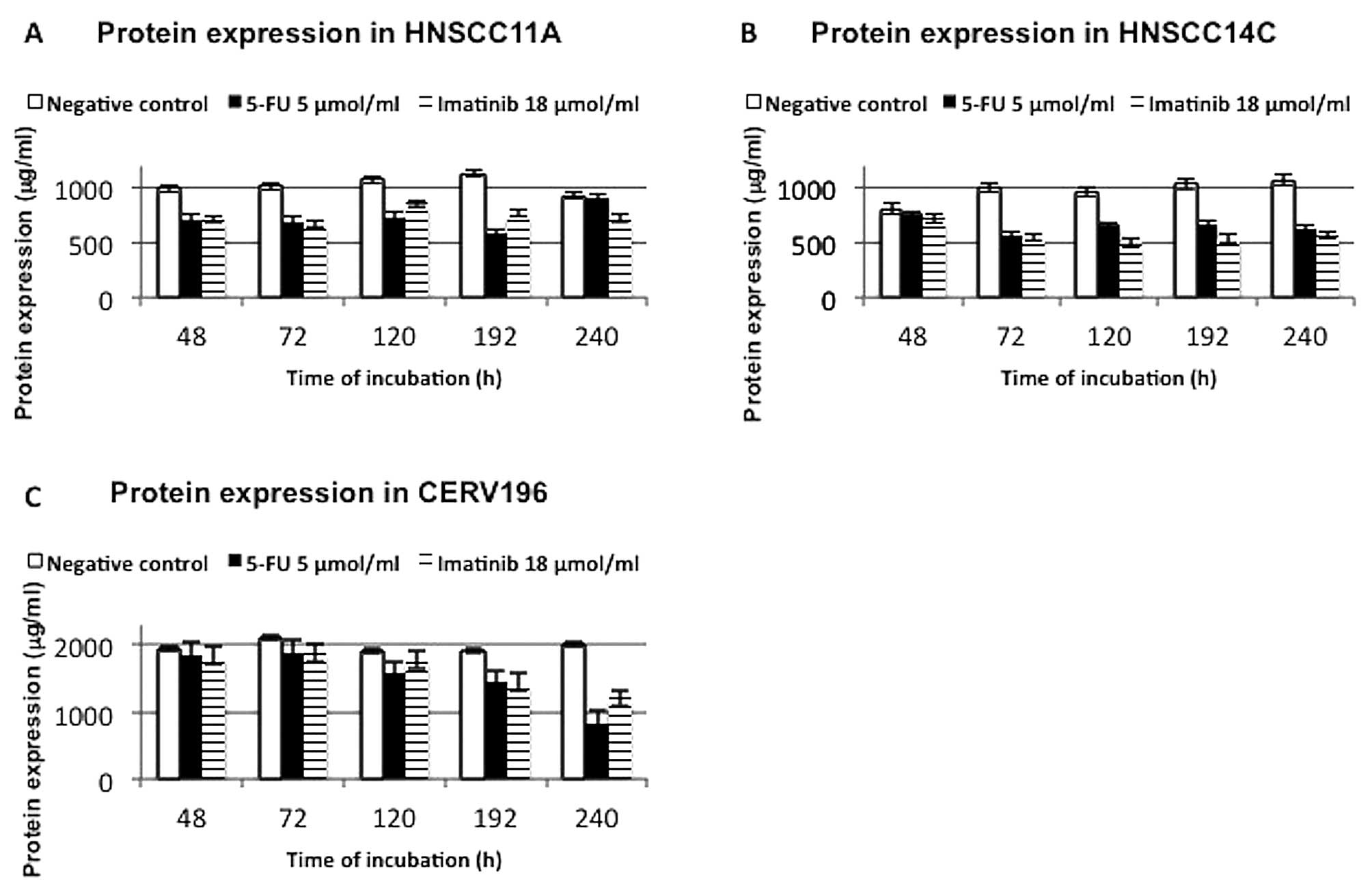 Compared to the HPV-negative tumour cell lines, the negative controls of the CERV196 cells exhibited higher total protein expression levels. The HPV16-positive SCC cell line was vulnerable to 5-FU and imatinib therapy. However, the CERV196 cells showed only a less higher decreasing of total protein expression after 240 h of treatment with 5-FU. In summary, the HPV-negative cell lines showed no significant differences after treatment with imatinib and 5-FU. We found a lower expression of total protein after prolonged treatment time with imatinib in the HNSCC11A and HNSCC14C cells compared to incubation with 5-FU. The drug concentration had no significant influence on the expression of total protein (Fig. 2).