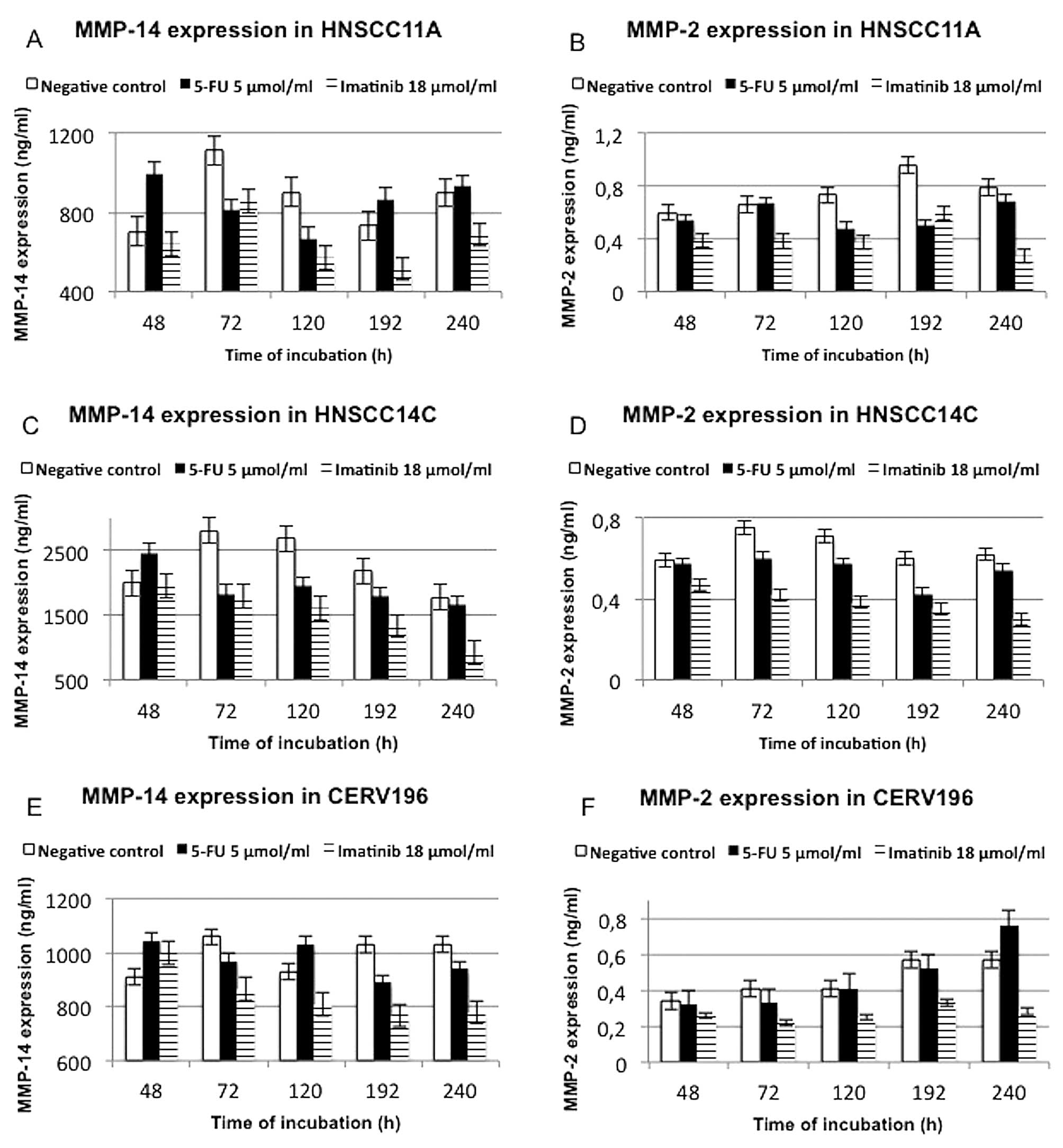 To analyze the effect of 5-FU and imatinib on HNSCC cell lines and the HPV-positive cell line CERV196, we added increasing concentrations of two chemotherapeutical agents, imatinib (18 μmol/ml) and 5-FU (5 μmol/ml), to the cell cultures. In order to determine MMP-2 as well as MMP-14 expression in the supernatant of the cell lines, ELISA analysis was carried out 48, 72, 120, 192 and 240 h after the start of incubation.