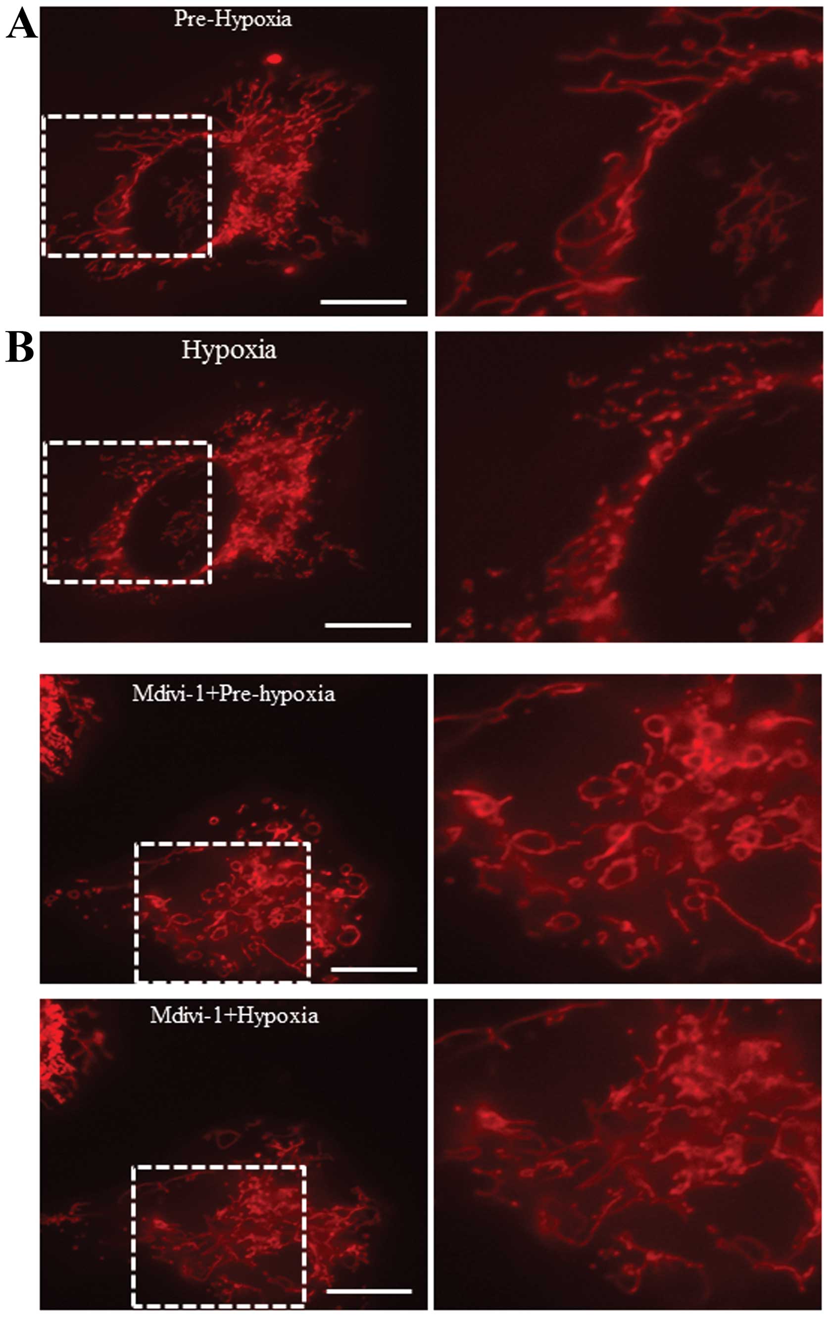 As previously described (32), pDsRed2-Mito was transfected into U251 cells to label mitochondria with Lipofectamine 2000. Twenty-four hours after transfection, mitochondrial morphology was observed with an inverted fluorescence microscope (Axiovert 200; Carl Zeiss Inc.) with excitation at 545 nm. After 6 h hypoxia treatment, U251 cells were fixed with 4% PFA, and mitochondrial morphology was detected again under fluorescence microscope after hypoxic treatment for 12 h. To examine the role of Drp1 on hypoxia-induced mitochondrial morphology, cells were pretreated with 5 μM Mdivi-1 1 h prior to hypoxia.