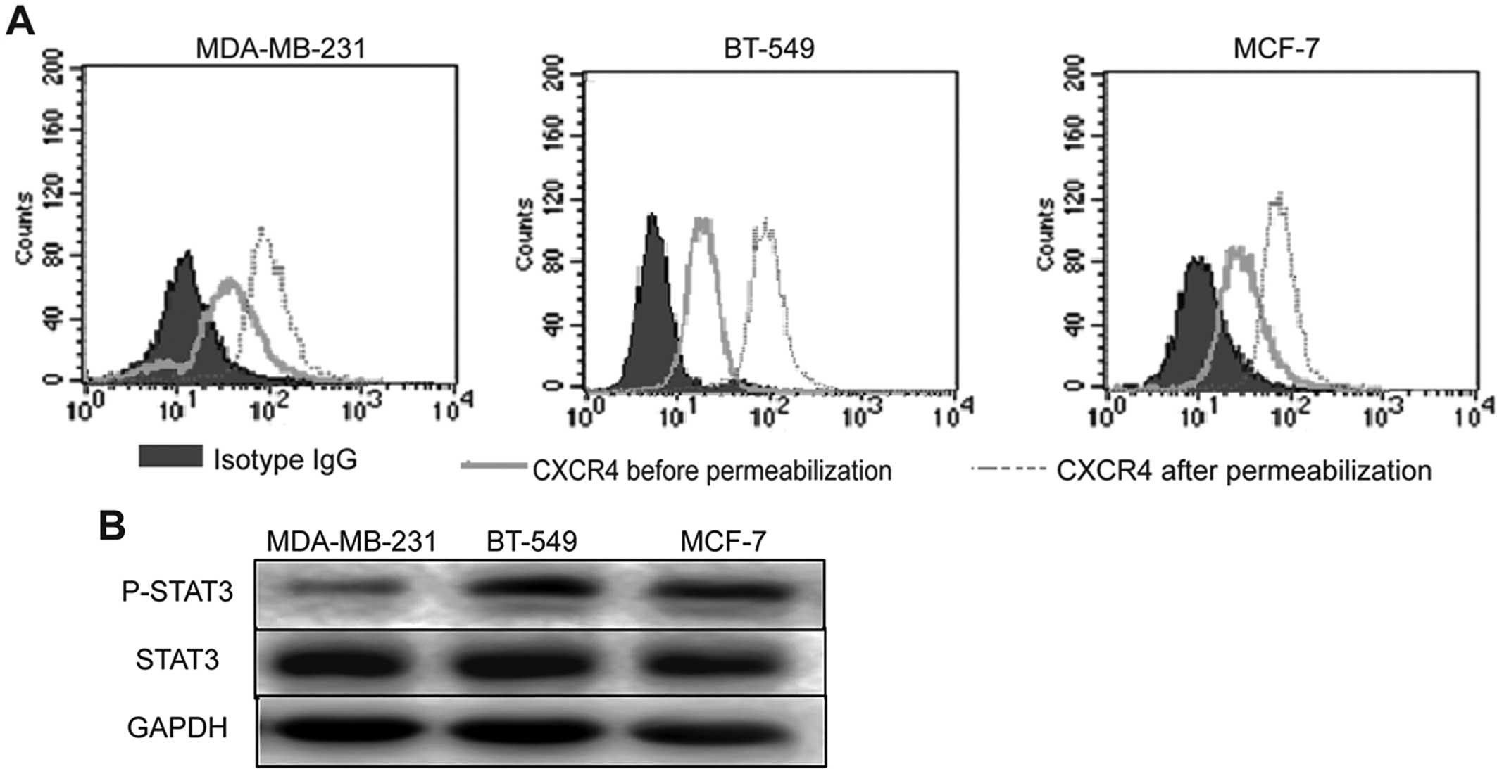The positive correlation of CXCR4 expression with the expression level of STAT3 and p-STAT3 in breast cancer suggests that p-STAT3 may be regulated by CXCR4. To investigate the signaling pathway that is involved in activation of STAT3 by CXCR4, three human breast cancer cell lines (MDA-MB-231, BT-549 and MCF-7) were analyzed for their expression of CXCR4, STAT3 and p-STAT3, using flow cytometry and western blot analysis. Flow cytometric analysis showed that CXCR4 was endogenously expressed in the cell membrane and cytoplasm of the MDA-MB-231, BT-549 and MCF-7 cells (Fig. 3A). Western blot analysis showed constitutive expression of STAT3 and p-STAT3 in all the breast cancer cell lines (Fig. 3B).