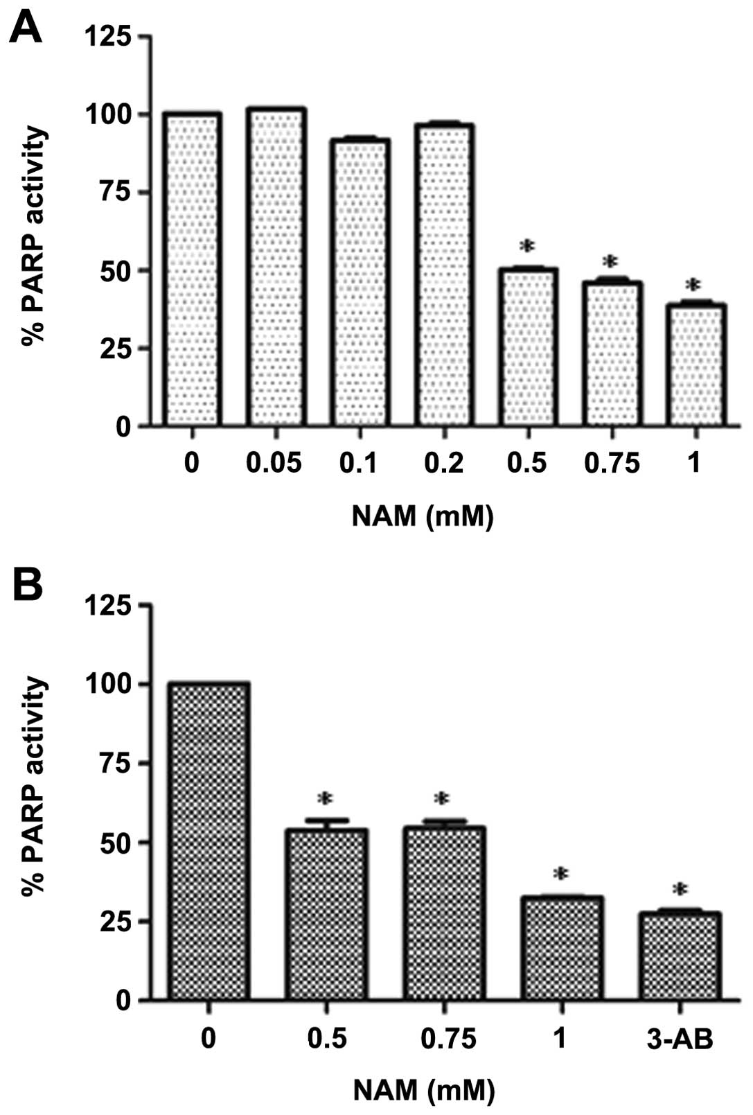 PARP activity in vitro was assayed using the Trevigen Universal Chemiluminescent PARP assay kit (Trevigen Inc., Gaithersburg, MD, USA) according to the manufacturer’s instructions. Recombinant PARP was incubated for 1 h with different NAM doses (0.05, 0.1, 0.2, 0.5, 0.75 and 1 mM) in the presence of activated DNA. Chemiluminescent detection was performed as per the manufacturer’s instructions. To assay endogenous PARP activity, cells were grown in a 25-cm2 cell culture flask in medium alone or with NAM for 72 h. The cells were washed once with ice-cold PBS, lysed in 50 μl of PARP buffer containing 0.5 mol/l NaCl, 1% (v/v) NP-40, and protease inhibitors (Sigma-Aldrich, St. Louis, MO, USA) on ice for 30 min with occasional vortexing. The lysates were clarified by centrifugation at 14,000 rpm, at 4°C for 10 min. The protein concentration of the extracts was determined using the Bradford protein dye reagent (Bio-Rad, Hercules, CA, USA), and PARP activity was assayed using the Trevigen Universal Chemiluminescent PARP assay kit according to the manufacturer’s instructions, with modifications. The lysate (30 μg/well) was added in duplicate to wells containing PARP buffer and PARP cocktail, followed by incubation at room temperature for 1 h with NAM at concentrations of 0.5, 0.75 and 1 mM. Activated DNA was added to the standards but was omitted from the extracts. The plate was washed three times with PBS and three times with PBS and 0.1% Triton X-100, followed by incubation with streptavidin horseradish peroxidase (1:1,000 dilution) in diluent buffer for 1 h. The plate was washed again three times with PBS alone and three times with PBS and 0.1% Triton X-100. Chemiluminescent detection was performed as per the manufacturer’s instructions. The background reading was subtracted from the readings of the samples, and PARP activity was calculated using the standard curve obtained from readings of the standards.
