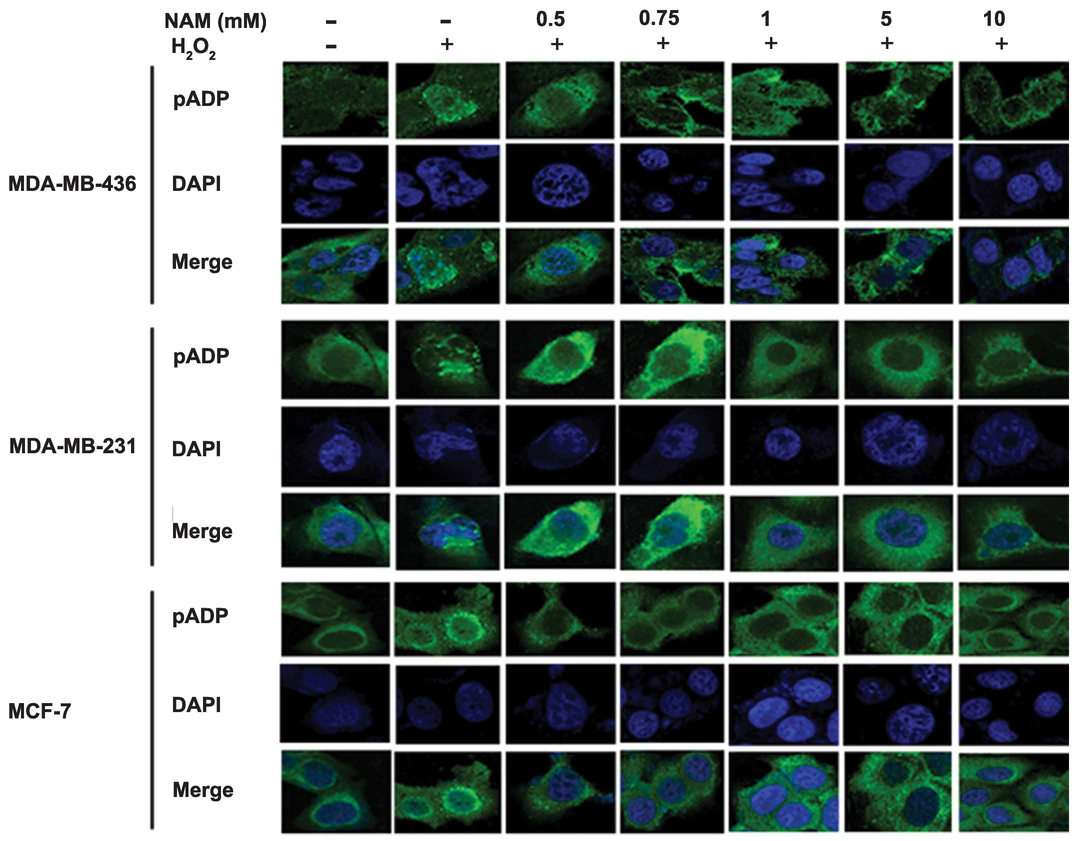 The MCF-7, MDA-MB-436 and MDA-MB-231 cells were grown in chamber slides (Sigma-Aldrich) at a 70% of confluence. Immunostaining for poly (ADP-ribose) (PAR) was performed on cells fixed in ice-cold 4% paraformaldehyde in PBS for 10 min. The cells were fixed 1 h after treatment with NAM at concentrations of 0.5, 1, 5 and 10 mM and exposed to H2O2 (1 mmol/l, 10 min, 37°C). Controls were treated with medium alone. The primary antibody used was anti-pADPR (H10, Santa Cruz Biotechnology, Inc., Santa Cruz, CA, USA). Poly ADP-ribosylation immunostaining was developed following NAM treatment. The secondary antibody used was the Alexa Fluor 488-conjugated goat anti-mouse IgG antibody (Molecular Probes, Life Technologies, Carlsbad, CA, USA). Nuclear counterstaining with DAPI was performed after removal of excess secondary antibody. Immunostaining was visualized with a Carl Zeiss confocal multiphotonic laser microscope 780 NLO (Hamburg, Germany).