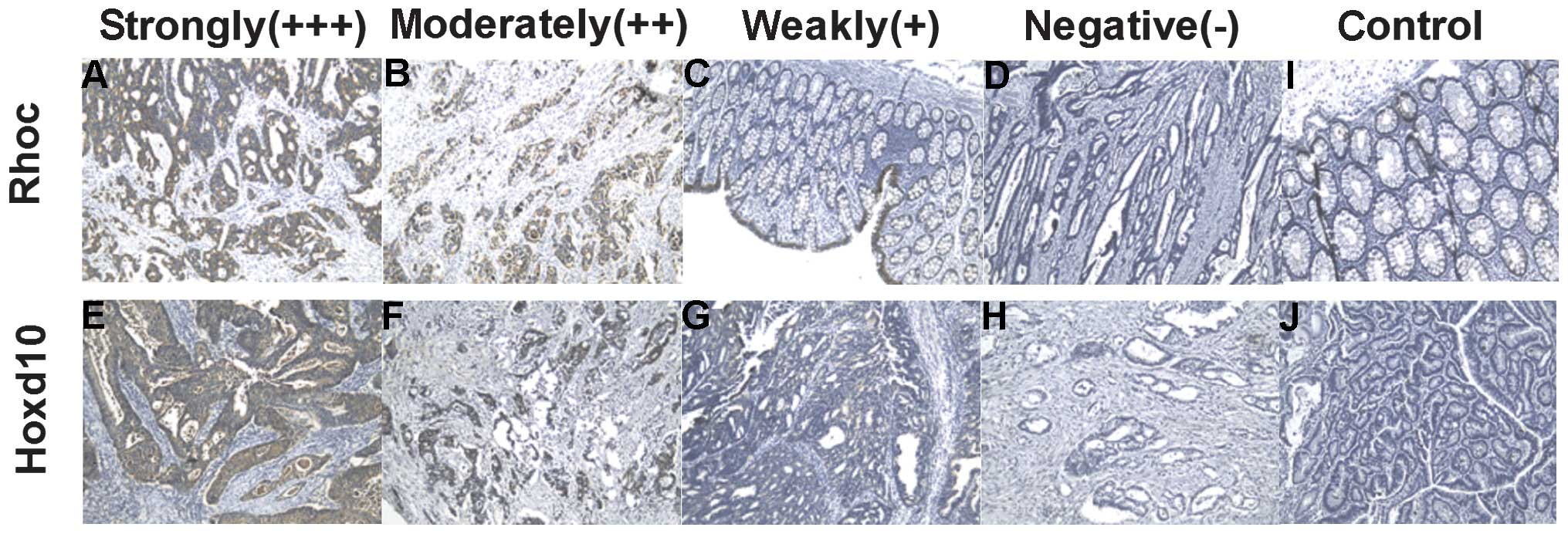 Sections (4 μm) were cut from formalin-fixed, paraffin-embedded samples, and stained with hematoxylin and eosin. These samples were reviewed by experienced pathologists. The primary antibody used for Rhoc immunostaining was a rabbit anti-Rhoc polyclonal antibody (Abcam), and for Hoxd10 immunostaining, a goat polyclonal anti-Hoxd10 antibody (Abcam). The sections were incubated with HRP-conjugated anti-rabbit IgG polyclonal secondary antibody (Abcam) for 45 min, and the reaction products were visualized by immersing the sections in 0.03% diaminobenzidine solution containing 2 mM hydrogen peroxide for 1–5 min. Nuclei were lightly stained with Mayer’s hematoxylin. For control studies of the antibodies, serial sections were treated with phosphate-buffered saline, and a normal goat IgG monoclonal antibody (Abcam) was used instead of the primary antibodies. These were confirmed to be unstained. Quantitative comparative analysis of immunohistochemical staining was carried out in each case. Two independent pathologists performed quantitative assessment of the immunohistochemical staining. Staining in nuclei was graded as follows: 0, no immunoreactive cells evident; 1, proportion of immunoreactive cells <20%; 2, 20–70%; 3, >70%. Immunohistochemical reactivity was evaluated and classified into the groups: 1, negative (−); 2, weakly positive (+); 3, moderately positive (++); 4, strongly positive (+++).