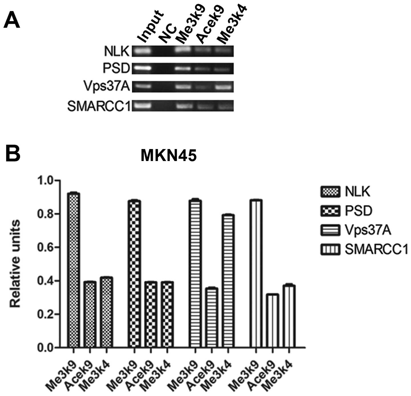 To validate the microarray results, the selected genes, PSD, NLK, SMARCC1 and Vps37A exhibited a high ratio of H3-K9 trimethylation over acetylation or a high ratio of H3-K9 methylation over H3-K4 trimethylation in the MKN45 cell line. These results were verified by ChIP-qPCR. As shown in Table VI and Fig. 1, qPCR results for the selected candidate genes were consistent with the ChIP-chip data.