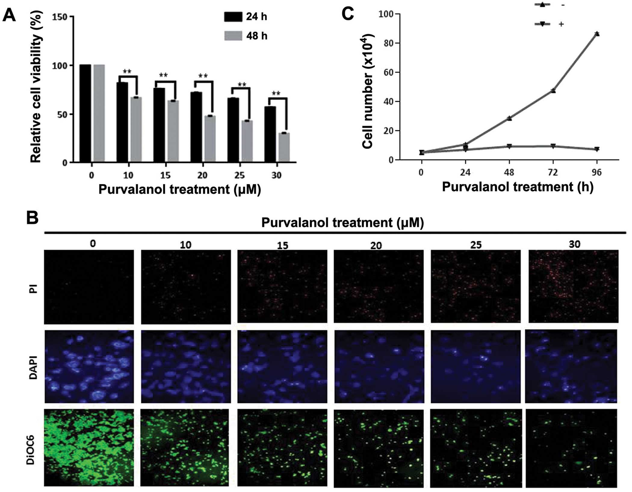 In order to understand the time- and dose-dependent effects of purvalanol treatment on HCT 116 cell viability, we performed an MTT assay. According to the MTT assay, 15 μM of purvalanol decreased the cell viability by 25% in HCT 116 cells within 24 h. Exposure to purvalanol for 48 h decreased cell viability by 40% (Fig. 1A). Moreover, PI and DAPI staining of cells after dose-dependent purvalanol treatment for 24 h showed that cell death and nuclear condensation were increased in the HCT 116 colon cancer cells. In addition, we also determined that MMP disruption was increased in dose-dependent manner in the HCT 116 colon cancer cells (Fig. 1B). Cell survival analysis with trypan blue dye exclusion assay showed that 15 μM purvalanol inhibited cell proliferation after 24 h and this cytostatic effect was maintained until 72 h (Fig. 1C).