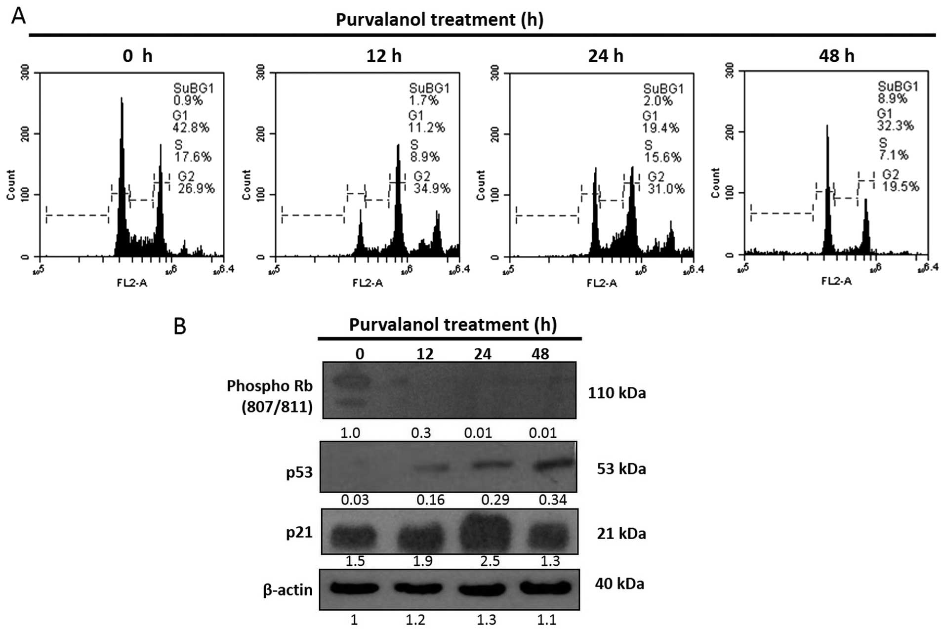 The effect of purvalanol on the cell cycle profile of HCT 116 cells was examined following PI staining by FACS flow analysis. 15 μM of purvalanol increased the subG1 population in a time-dependent manner (12, 24 and 48 h), to 1.7, 2 and 8.9%, respectively (Fig. 2A). In order to confirm FACS flow analysis, we analyzed major cell cycle coordinating proteins such as phosphorylated Rb, p53 and p21 by immunob-lotting. According to the immunoblotting results, purvalanol treatment increased the expression of p53 in a time-dependent manner, but significant upregulation was determined after a 48 h purvalanol treatment in the HCT 116 colon cancer cells. However, expression of p21 was increased only after a 24 h purvalanol treatment. Moreover, protein expression of the phosphorylated form of Rb (807/811) was sharply downregulated only after 12 h in HCT 116 colon cancer cells (Fig. 2B).