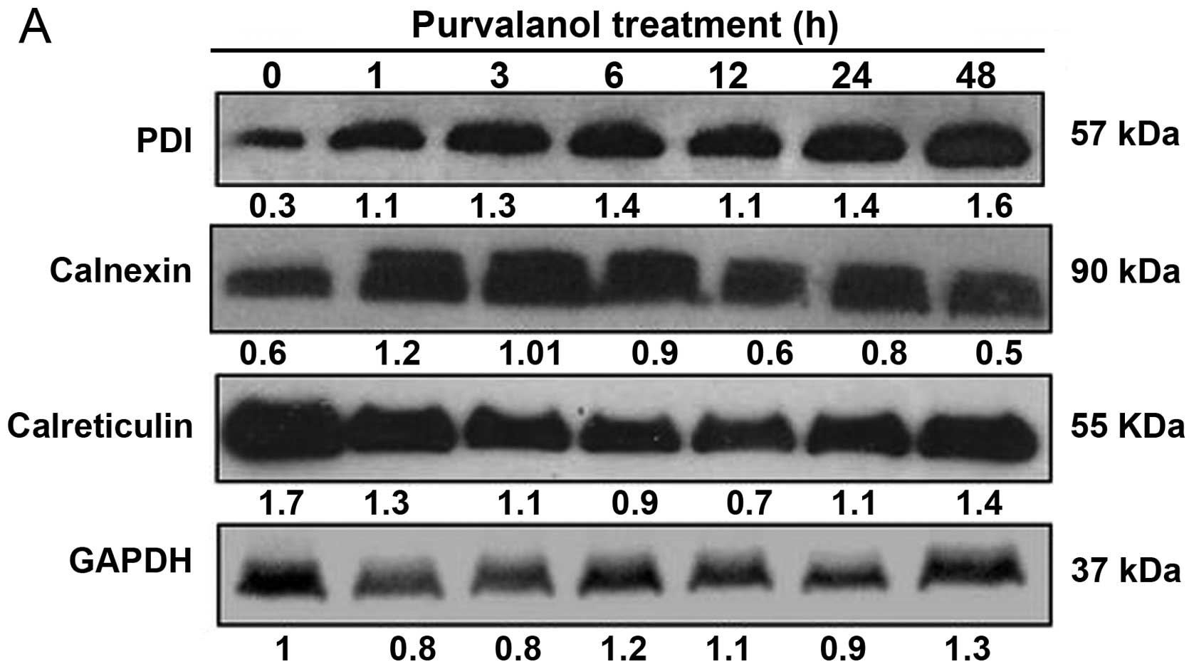 During homeostatic conditions in eukaryotic cells, ER is essential in biosynthesis and signaling functions, and several resident chaperones, Ca2+ binding proteins and folding enzymes such as calnexin, calreticulin and protein disulfide isomerase (PDI) are known to monitor ER biological functions (16). It was shown that a lack of calnexin within the cell induced a resistant profile against ER stress-mediated apoptosis as it acts with caspase-8 for Bap31 protein cleavage (17). In addition, although overexpression of calreticulin in HeLa cells was shown to enhance the sensitivity against ceramide-induced apoptosis (18), knockout of calreticulin increased the resistance phenotype (19). Moreover, silencing of calreticulin in bladder cancer cells suppressed cell proliferation, migration and attachment, whereas overexpression of calreticulin enhanced cell migration and attachment (20). Thus, in the present study, we determined that purvalanol induced UPR as a first response. Both PDI and calnexin expression profiles were upregulated following a 1 h purvalanol treatment and this effect was observed until 12 h. In addition, calreticulin expression was downregulated at early time-points following purvalanol treatment which modulated Ca2+ levels and cell adhesion (Fig. 3A). These results suggest that purvalanol might first trigger ER stress via ER chaperone activation in HCT 116 colon cancer cells.