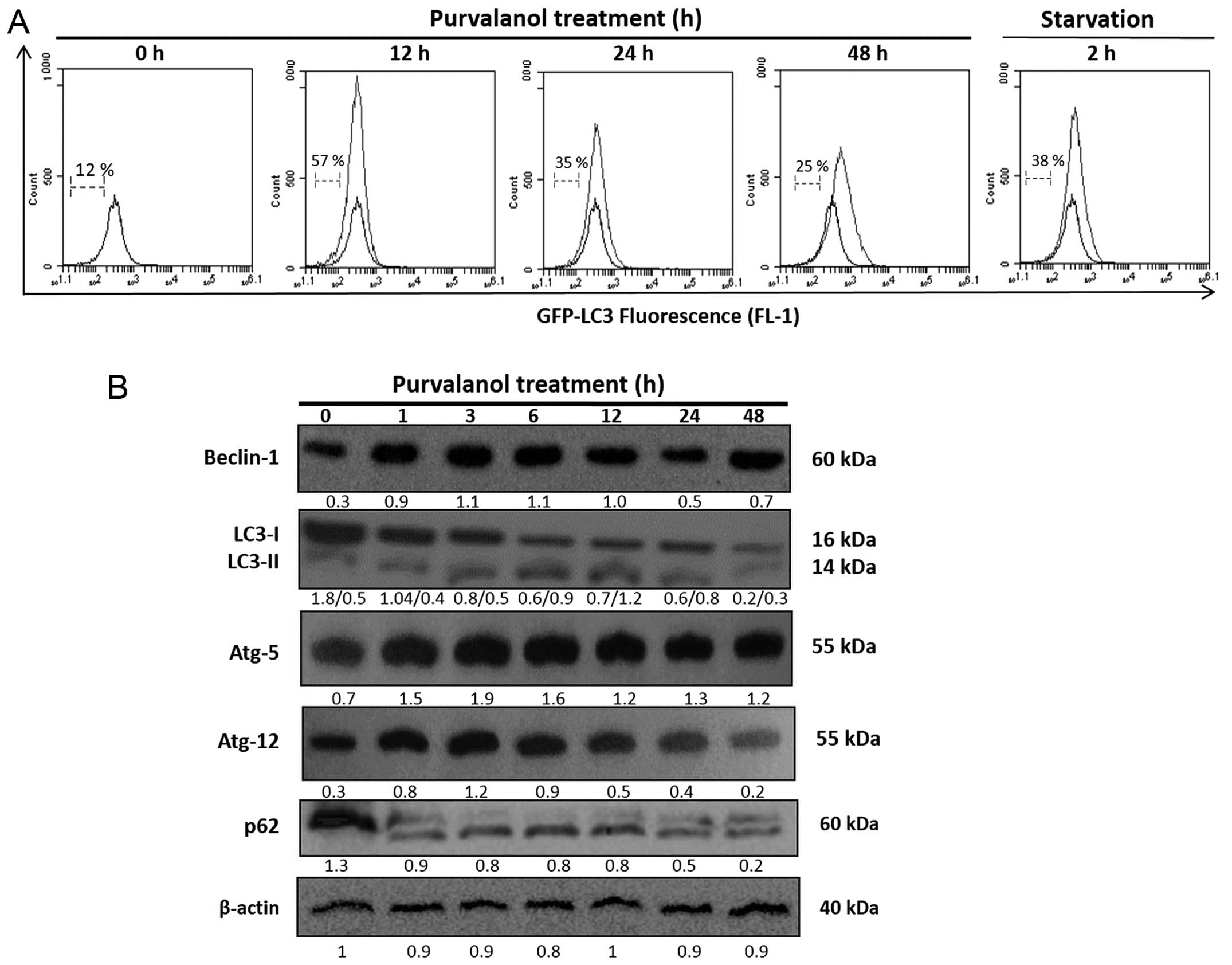 HCT 116 colon carcinoma cells were seeded in 6-well plates and transfected with a green fluorescent protein (GFP)-tagged LC3-expressing vector (0.5 μ/ml) using Fugene6. After a 24 h transfection, the cells were exposed to purvalanol (15 μM) for 12, 24 and 48 h. Following purvalanol treatment, GFP-LC3 plasmid-transfected 10,000 cells/sample were determined by flow cytometry using FL-1 (green fluorescence) (FACScan, Attune; Applied Biosciences).