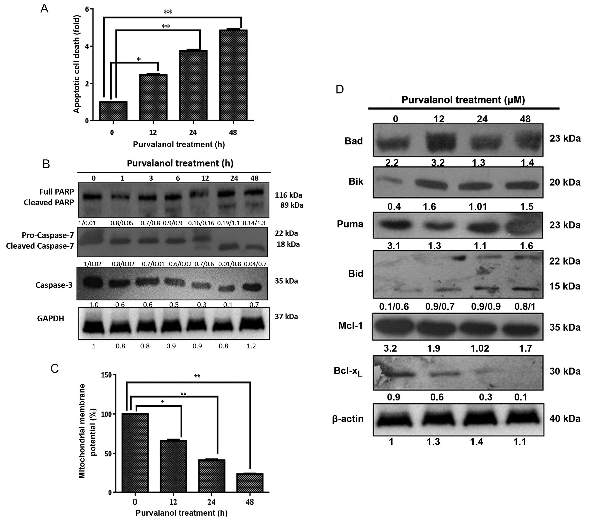 The apoptotic induction due to purvalanol was determined by Cell Death ELISA assay. As shown in Fig. 5A, exposure of cells to 15 μM purvalanol for 12, 24 and 48 h induced apoptosis by 2.5-, 3.5- and 5.5-fold compared to the untreated control cells (p<0.05 and p<0.001), respectively. The apoptotic induction of purvalanol was found to be caspase-dependent. As shown in Fig. 5B, caspase-7 and caspase-3 were activated by causing PARP cleavage. As shown in Fig. 5C, 15 μM purvalanol for 12, 24 and 48 h induced MMP loss by 75, 55 and 40%, respectively (p<0.05 and p<0.001). To analyze the functional role of Bcl-2 family members in mitochondria-mediated apoptosis due to purvalanol treatment, the modulation of the expression levels of anti- and pro-apoptotic proteins was examined in the HCT 116 cells by western blot analysis. Purvalanol down-regulated Bcl-xl and Mcl-1 and upregulated Bik, Bad, Bid, Bad and PUMA protein expression levels (Fig. D). Therefore, we conclude that purvalanol induced mitochondria-mediated apoptosis by activating caspases and modulating Bcl-2 family members.