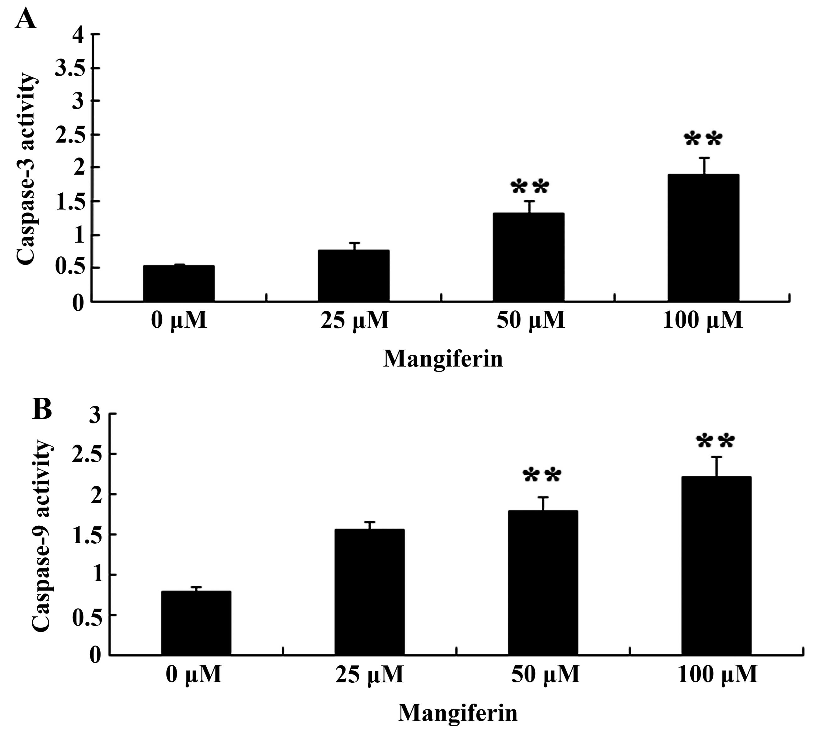 To further elucidate the effects of mangiferin on caspase-3 and caspase-9 activation in the U87 glioma cells, caspase-3 and caspase-9 activation was estimated using activity assay kits. Caspase-3 and caspase-9 activation was also markedly increased following the treatment of mangiferin (50 and 100 μM) for 48 h in comparison to that of the 0 μM mangiferin treatment group (Fig. 4).