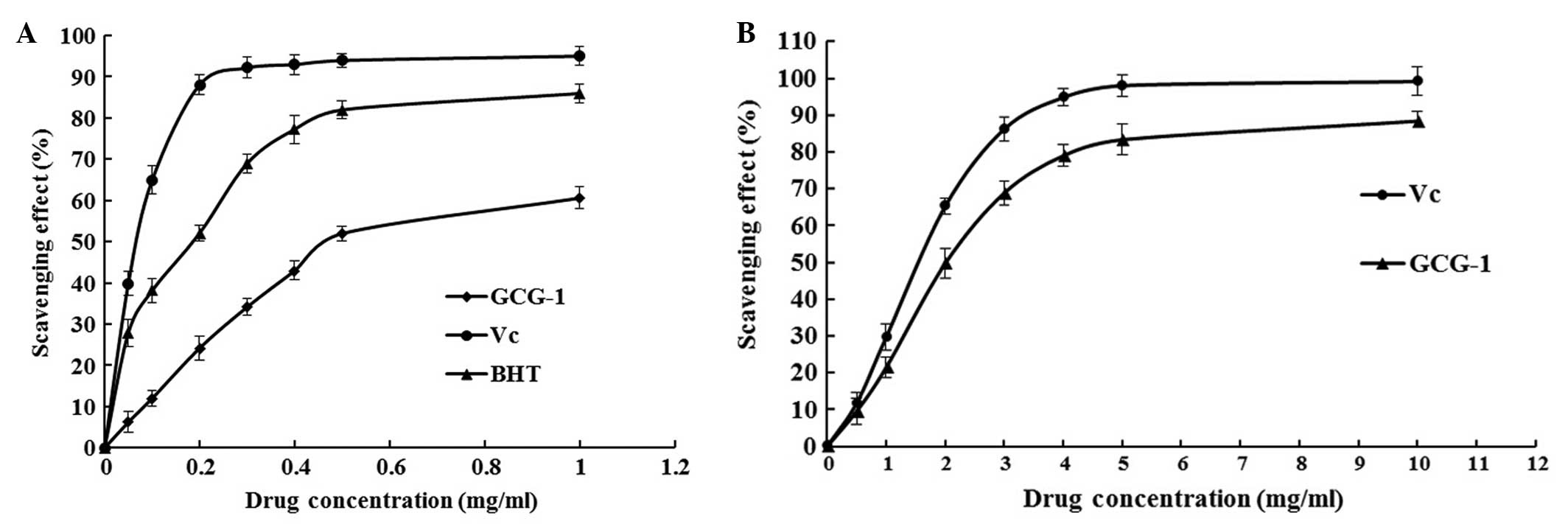 The decrease in absorbance of the DPPH− radical caused by antioxidants is due to the reaction between antioxidant molecules and radical progress which results in the scavenging of the radical by hydrogen donation. It is visually noticeable as a change in color from purple to yellow. GCG-1 exhibited a comparable antioxidant activity with that of standard ascorbic acid at varying concentrations tested. There was a dose-dependent increase in the percentage of antioxidant activity for all concentrations tested (Fig. 5). These results showed that the IC50 value of GCG-1 for eliminating DPPH− radicals was ~0.467 mg•ml−1, which indicated that GCG-1 had a noticeable effect on scavenging the DPPH− radical, particularly at high addition quantity. However, the inhibitory ability was lower than that of BHT and Vc.
