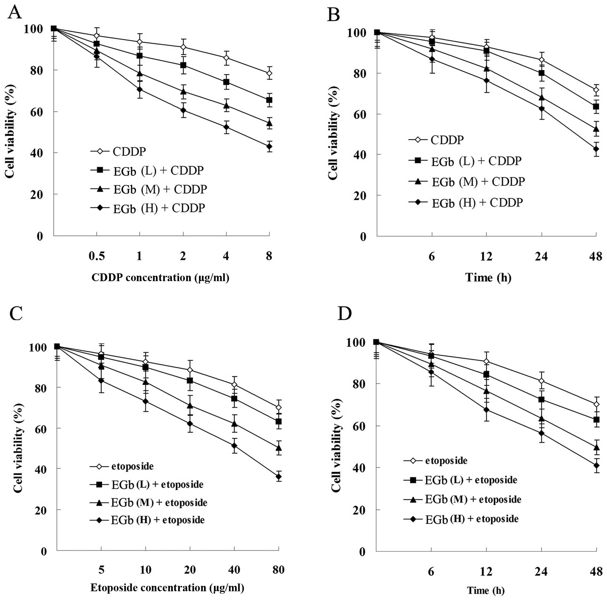 Mao YB, Liu SQ, Tan L, Zhou Q and Huang JA: EGb761 enhances cisplatin and etoposide-induced apoptosis of human gastric cancer SGC-7901 cells. Shijie Huaren Xiaohua Zazhi. 21:3330–3337. 2013.In Chinese.
