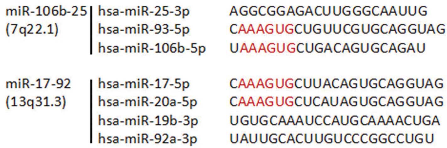The miR-17-92 cluster (miR-17, miR-18a, miR-19a, miR-20a, miR-19b-1 and miR-92-1) is a typical case known as oncogenes in diverse tumor subtypes. However, as a paralog of the miR-17-92 cluster, the function of the miR-106b-25 cluster, including 3 miRNAs (miR-106b, miR-93 and miR-25), remains largely unclear in carcinogenesis. In the present study, all members of the miR-106b-25 cluster and 4 miRNAs in the miR-17-92 cluster were included in the aberrantly expressed miRNAs. Ventura et al (25) showed that the functions of the miR-106b-25 cluster are seemingly dispensable in normal mouse embryonic development and is the only study in the context of miR-17-92 cluster loss. In our data, the aberrant expression of members in the miR-17-92 cluster (miR-92a-3p, miR-18a-5p and miR-19b-3p) was found in WHO II gliomas, while dysregulated expression of miRNAs in the miR-106b-25 cluster (miR-106b-5p and miR-93-5p) was detected in WHO III gliomas. Two members of the miR-106b-25 cluster have an identical seed sequence (nucleotides 2–7), which is also the seed sequence of two members of the miR-17-92 cluster (Fig. 1). The highly conserved feature of this region indicates the functional importance of these miRNAs. However, according to the results of prevailing target prediction models, it is also reasonable to suppose that these miRNAs should be functionally redundant. As observed during normal development of mice, enhanced expression of the miR-106b-25 cluster plays an assistant role in glioma progression and results in greater proliferation ability and anti-apoptotic effects in tumors with upregulated expression levels of the miR-17-92 cluster. There is reason to believe that the miR-106b-25 cluster plays an indispensable role in the malignant process of gliomas by promoting cell cycle progression, enhancing cell proliferation, inhibiting cell apoptosis and inducing blood vessel formation (26–29). Despite the great progress made in understanding the cluster’s roles, the expression pattern and the precise role of each miRNA in gliomas need to be deeply elucidated. Further study of the function of the miR-106b-25 cluster may provide new insight into the role of miRNAs in the development and progression of human gliomas.