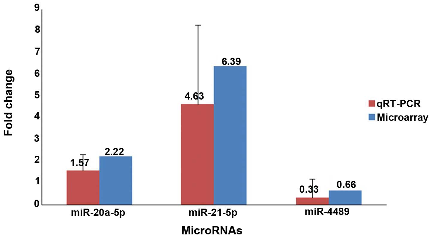 Quantitative reverse transcription-PCR (qRT-PCR) was performed for verification of miRNA microarray results using 3 selected miRNAs (miR-20a, miR-21 and miR-4489). A total of 1 μg of RNA was reverse-transcribed into cDNA using the All-in-One™ miRNA First-strand cDNA synthesis kit (AMRT-0600; GeneCopoeia, Rockville, MD, USA) according to the manufacturer’s instructions. Next, the resulting cDNA (1:5 dilution) was amplified and assayed by qPCR, with the 7500 Real-Time PCR system (Applied Biosystems). Specific primers of the miRNAs (HmiRQP0312, HmiRQP0316, HmiRQP2129 and HmiRQP9001) were provided by GeneCopoeia. All PCR reactions were analyzed in triplicate. Relative quantification for each sample was calculated using the 2−ΔΔCt method, with the universally expressed small nuclear RNA U6 used as the endogenous control. A pooled human brain cerebral cortex total RNA (Clontech, USA) was used as the normal control.