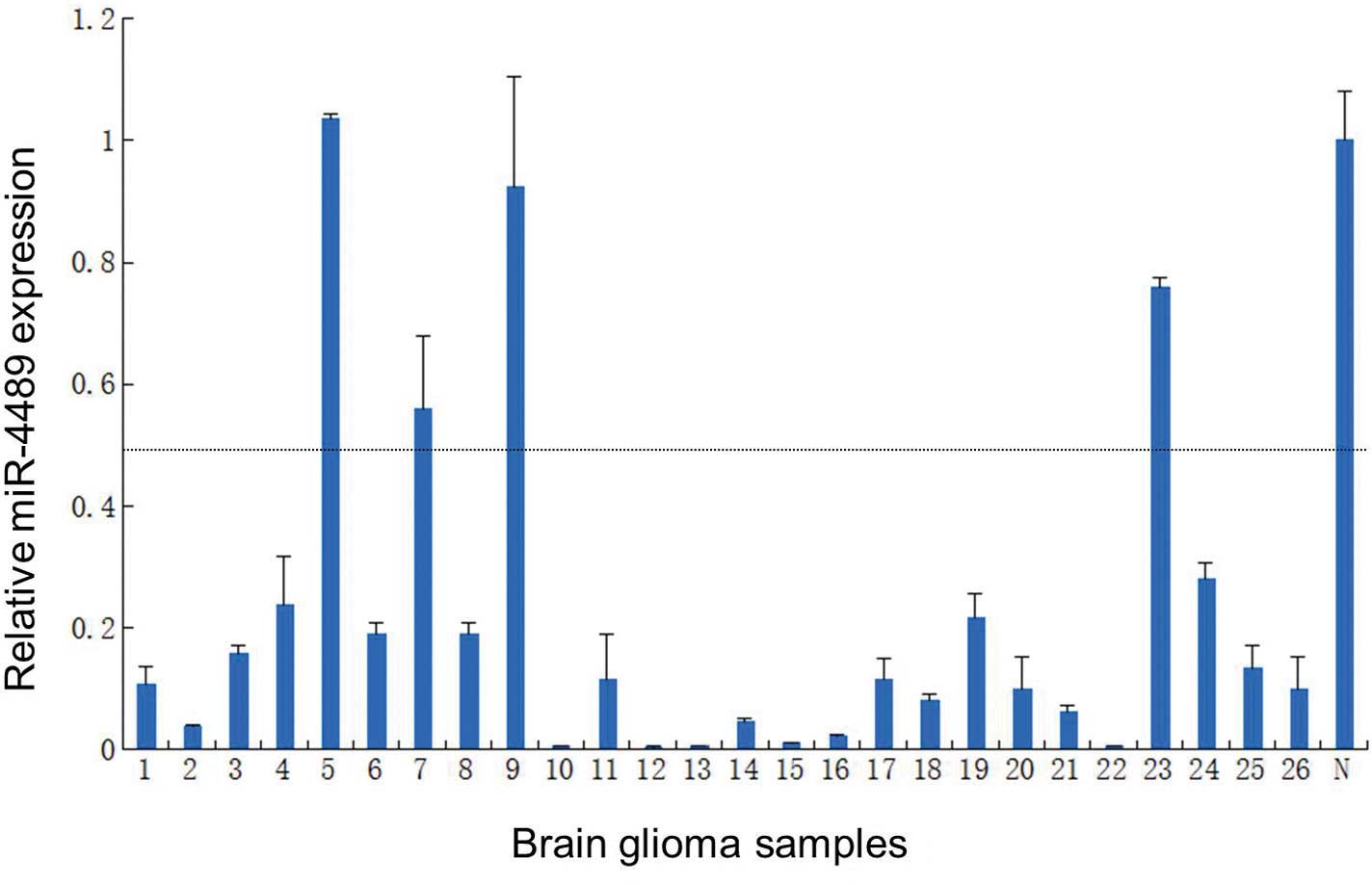 To improve sample representativeness, 3 candidate miRNAs, miR-20a-5p (randomly selected), miR-21-5p (the common upregulated) and miR-4489 (the only one downregulated), were selected to validate the microarray data by quantitative RT-PCR assay using the same RNA samples that were used for the microarrays. The adjacent non-cancerous tissues acted as the control in the same groups for both experiments. Compared with the adjacent non-cancerous tissues, the expression levels of miR-20a-5p (P=0.049, n=9) and miR-21-5p (P=0.017, n=9) were present in higher abundance, whereas miR-4489 (P=0.045, n=9) was present in lower abundance in the gliomas. The results of quantitative RT-PCR were in accordance with the miRNA microarray results (Fig. 3). Furthermore, we investigated the expression of miR-4489 by qRT-PCR in 26 glioma samples. The results presented in Fig. 4 revealed that 84.62% (22/26) of gliomas had a reduced miR-4489 expression compared to the normal human cerebral cortex total RNA (Clontech).