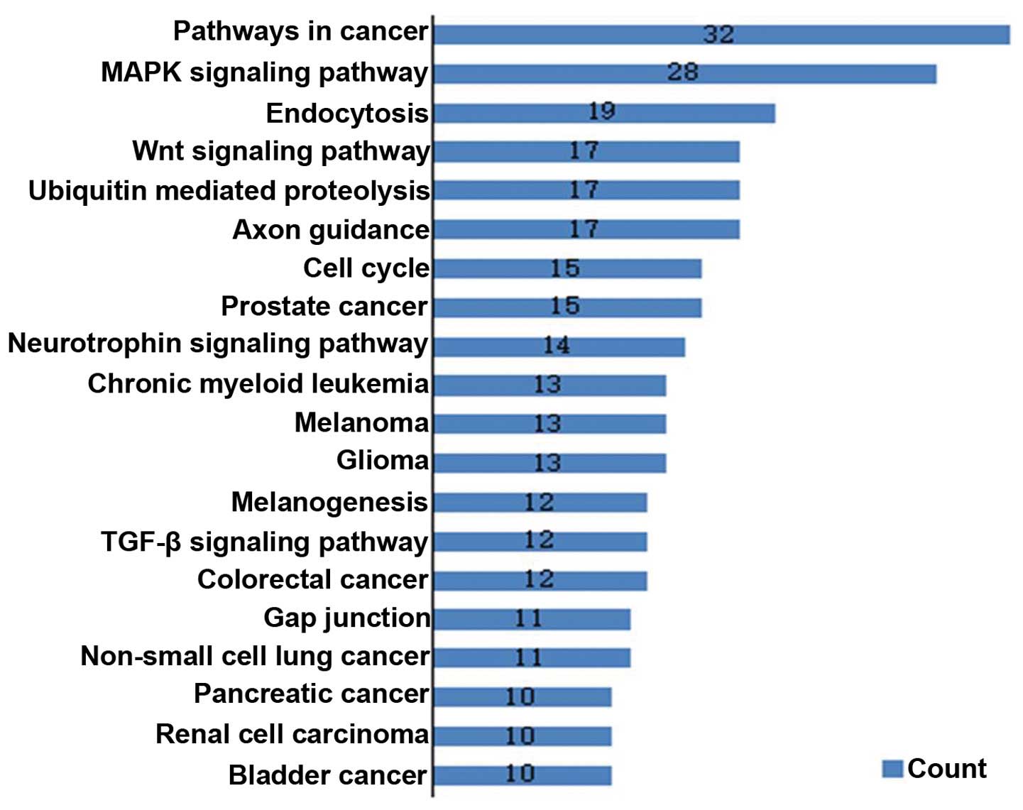 The potential target genes of the 13 dysregulated miRNAs were predicted by different algorithms, including TargetScan, PICTAR and miRanda. Only miRNA target genes identified by all of these algorithms were considered. Some of the miRNAs, for example, miR-4489 were only included in the database of TargetScan; hence, target genes of miR-4489 in TargetScan were selected as a part of the target gene set for further analysis. A total of 926 target genes were predicted. Target genes (720) and 162 significant categories were found in Gene Ontology Biological Process when GO analysis was performed in the DAVID database (DAVID Bioinformatics Resources 6.7). A large number of target genes were involved in the enriched GO categories notably genes involved in the regulation of cell proliferation, the cell cycle, apoptosis and neuronal differentiation. Pathway analysis based on the KEGG pathway database identified 239 target genes and 20 enriched pathways (P<0.01) (Fig. 5).