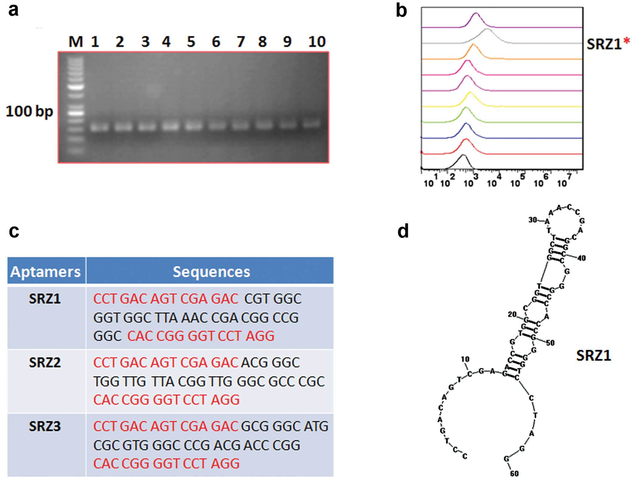 Based on the binding efficiency results, the 10th round of enriched ssDNA pool was amplified using unmodified primers and cloned into Escherichia coli using the TA cloning kit (Invitrogen). The candidate aptamer sequences were determined by Invitrogen Co., Ltd. (Shanghai, China). Nine aptamers were selected, and the binding affinity was detected by amplifying FAM-labeled ssDNA aptamers using FAM-conjugated primers. In brief, the target cells (1×106) were incubated with varying concentrations of FITC-labeled aptamers in 500 µl binding buffer on ice for 30 min. Cells were washed twice after incubation, and the fluorescence intensity was determined by flow cytometry. Three aptamers with high binding affinity were sequenced, and the structure of aptamer SRZ1 with best binding affinity was predicted by RNA structure software.