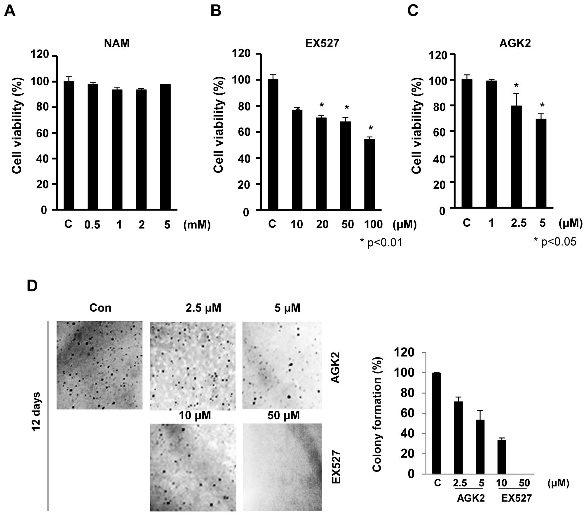 To further assess the effect of EX527 and AGK2 on tumorigenicity, we compared the anchorage-independent growth rates. Twelve days after EX527 (50 μM) and AGK2 (5 μM) treatment, HeLa cells showed a significantly reduced colony forming ability in soft agar to ~95 and 46% of the control cells, respectively (Fig. 1D). Together, our observations showed that EX527 and AGK2 suppressed the malignant phenotype such as cell proliferation and colony formation.