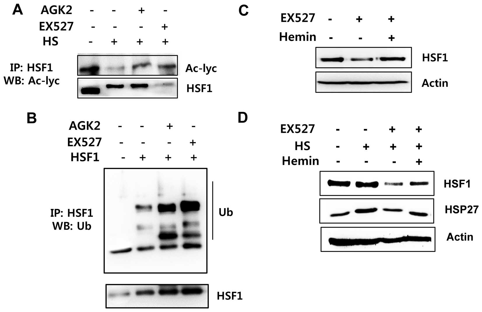 Our study revealed that EX527 and AGK2 negatively regulated the expression and/or phosphorylation of HSF1, but the mRNA level of HSF1 did not change. In addition, reduced HSF1 by EX527 or AGK2 was recovered in the presence of hemin, a proteasome inhibitor, suggesting that HSF1 may be degraded by proteasomal machinery following EX527 or AGK2 treatment. To confirm this hypothesis, we observed that the inhibition of HSF1 deacetylation by EX527 and AGK2 reduced HSF1 protein abundance through HSF1 ubiquitination, indicating that the ubiquitin-proteasome system exerts an important role in the acetylation/deacetylation status of the HSF1 protein. The additional effect of HSF1 acetylation could induce HSF1 degradation in the nucleus and inhibit target genes involved in heat shock response, such as HSP27.