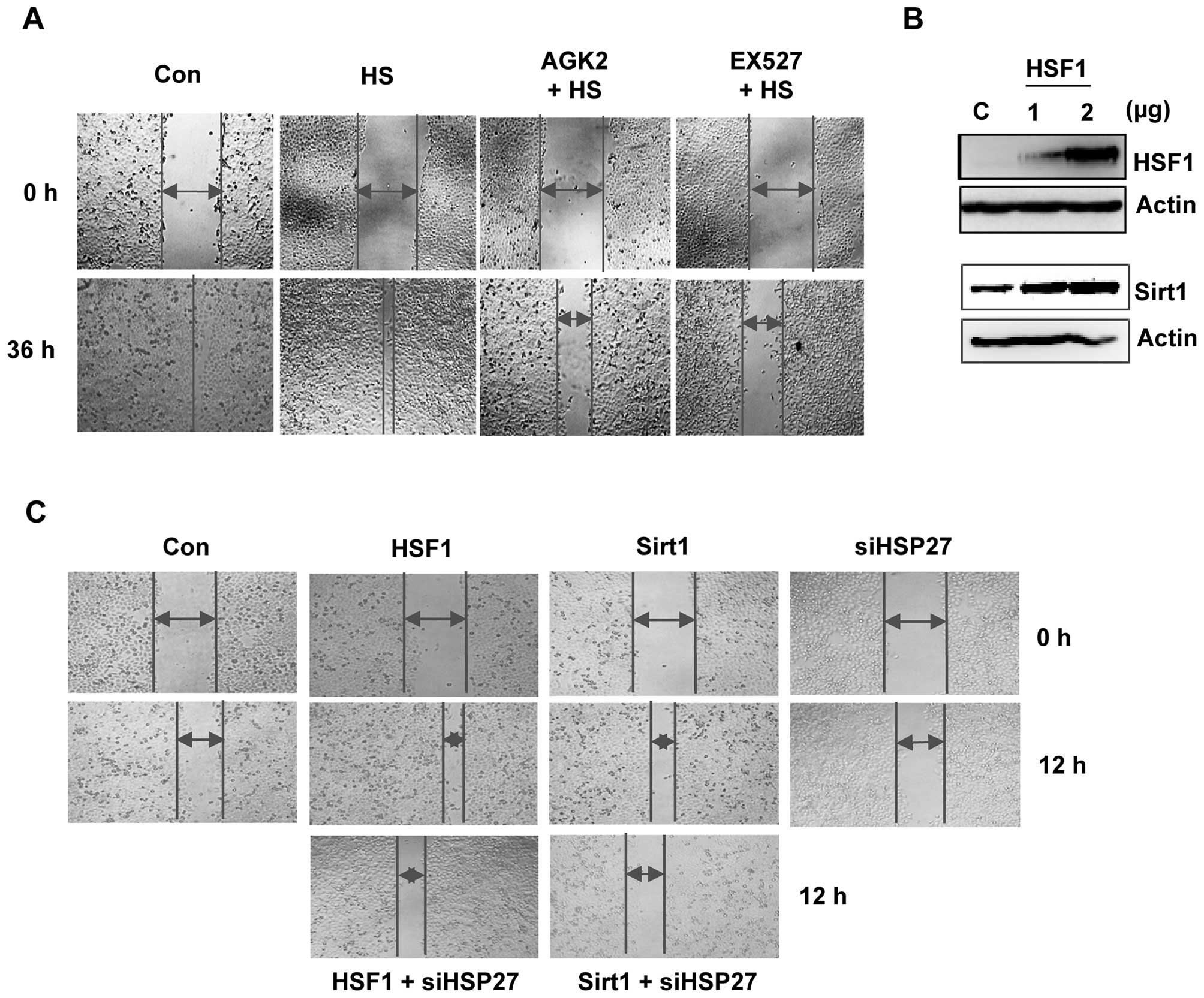 To investigate whether Sirt1/HSF1 modulate cell motility, we treated HeLa cells with EX527 and AGK2 for 36 h and performed a wound-healing experiment. EX527- or AGK2-treated cells showed reduced migration ability when compared with the control or heat shock-treated cells (Fig. 5A).
