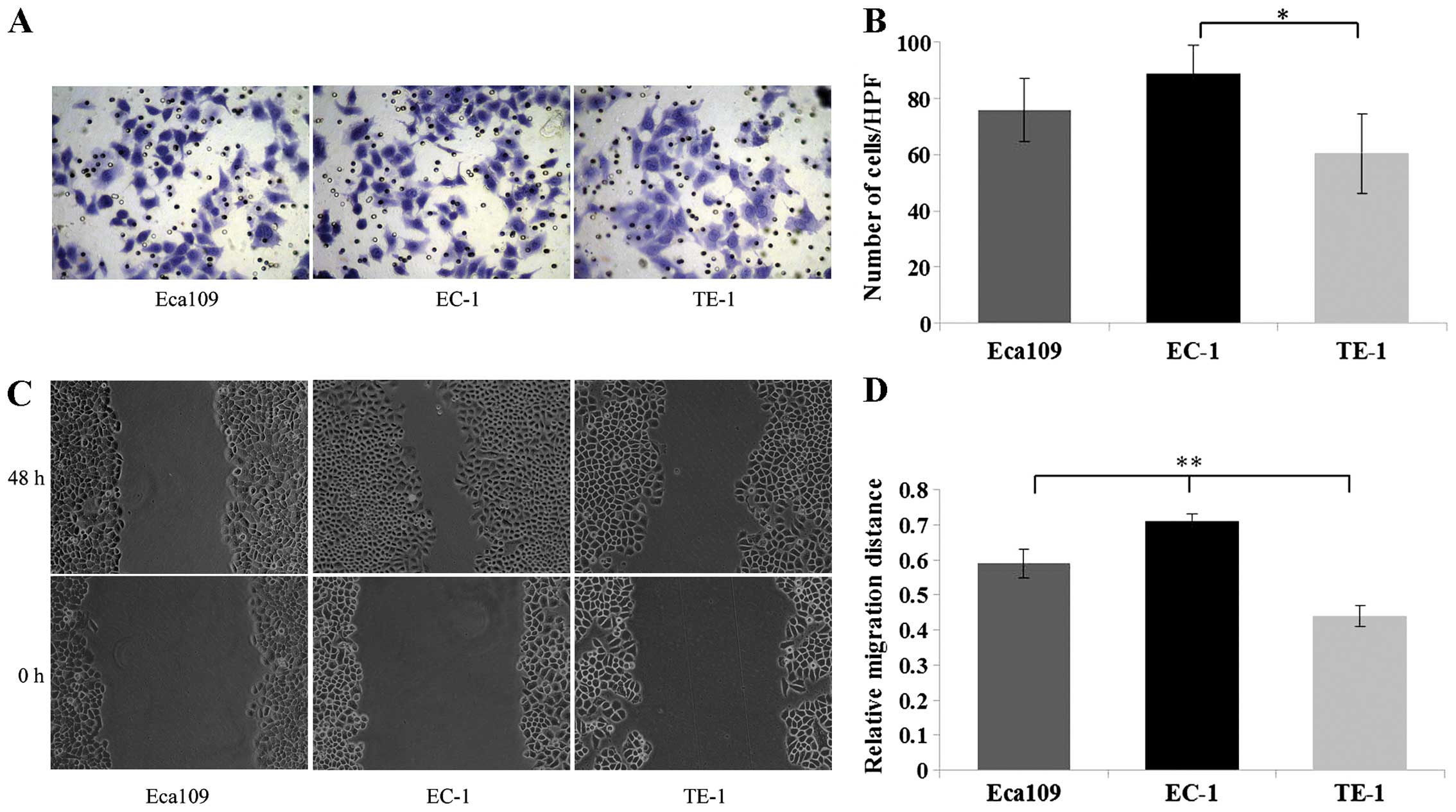 Based on the above clinical correlation analysis in the ESCC tissues, it is reasonable to hypothesize that ADAM10 plays an important role in promoting the invasion and migration of ESCC cells. Therefore, we next detected the invasion and migration ability of the ESCC cells using Matrigel invasion and scratch wound healing assays, respectively. The invasion assay demonstrated that the EC-1 cells exhibited a significant increase in the number of cells that traversed the membrane toward a chemoattractant as compared with the TE-1 cells (P<0.05) (Fig. 3A and B). Additionally, the scratch assay demonstrated that EC-1 cells showed a significant increase in the tumor cell migration distance as compared with the Eca109 and TE-1 cells (P<0.01) (Fig. 3C and D).