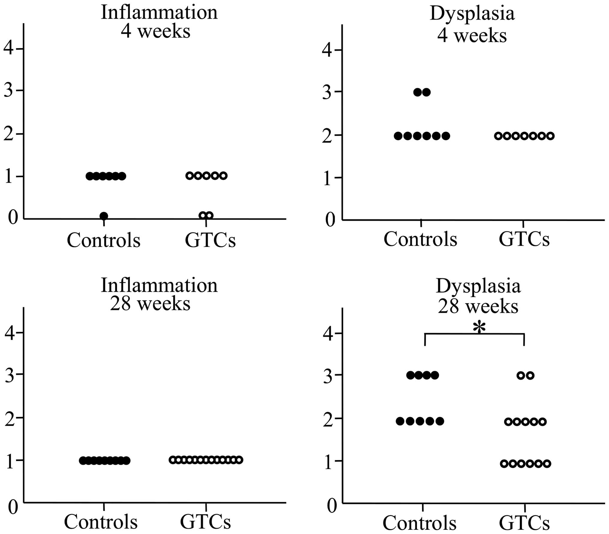 To evaluate the effects of GTC administration on gastritis, we performed histopathological examinations of the gastric mucosa. The mice developed minimal to mild corpus gastritis. Similar to the results of previous studies using INS-GAS mice (23,24,26), atrophy of the gastric fundic gland, hyperplasia of the glandular epithelium, and intestinal epithelium metaplasia and dysplasia were observed (Fig. 1). No differences in inflammation scores were observed between the GTC-administered group and the control group in either the 4-week or the 28-week administration clusters. In the 4-week groups, no differences in the dysplasia scores were observed between the GTC-administered group and the control group. However, the dysplasia score was significantly lower in the 28-week GTC-administered group than in the 28-week control group (Fig. 2). These results suggested that although INS-GAS mice inevitably slowly develop gastric cancer from gastritis regardless of the intervention, the progression of gastric mucosal dysplasia was inhibited by long-term GTC administration.