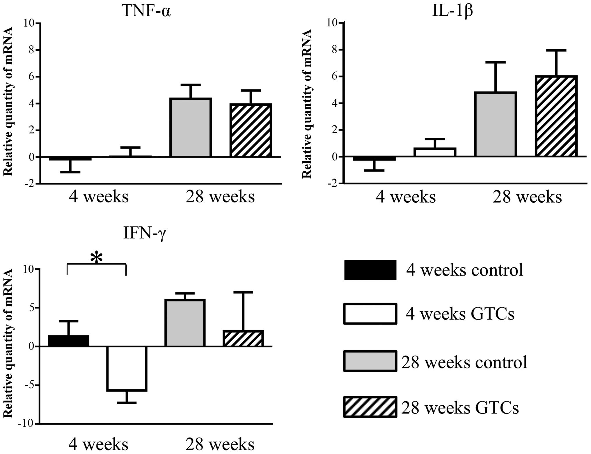 To molecularly evaluate the mechanism of changes in dysplasia, we analyzed messenger (m)-RNA expression of inflammatory cytokines such as IFN-γ, TNF-α and IL-1β in the gastric tissue (Fig. 3). In the 4-week administration cluster, mRNA levels of IFN-γ were significantly lower in the GTC-administered group than in the control group (P≤0.05). In addition, although not significantly different, the 28-week mRNA levels of IFN-γ were also lower in the GTC-administered group than in the control group (P=0.056). We also analyzed the mRNA expression of TNF-α and IL-1β, but no significant differences were observed between the GTC-administered group and the control group in either the 4-week or 28-week administration clusters. These results suggested that the expression of IFN-γ in the gastric mucosa was inhibited by GTC administration, but GTC administration had little or no effect on the expression of other inflammatory cytokines such as TNF-α and IL-1β.