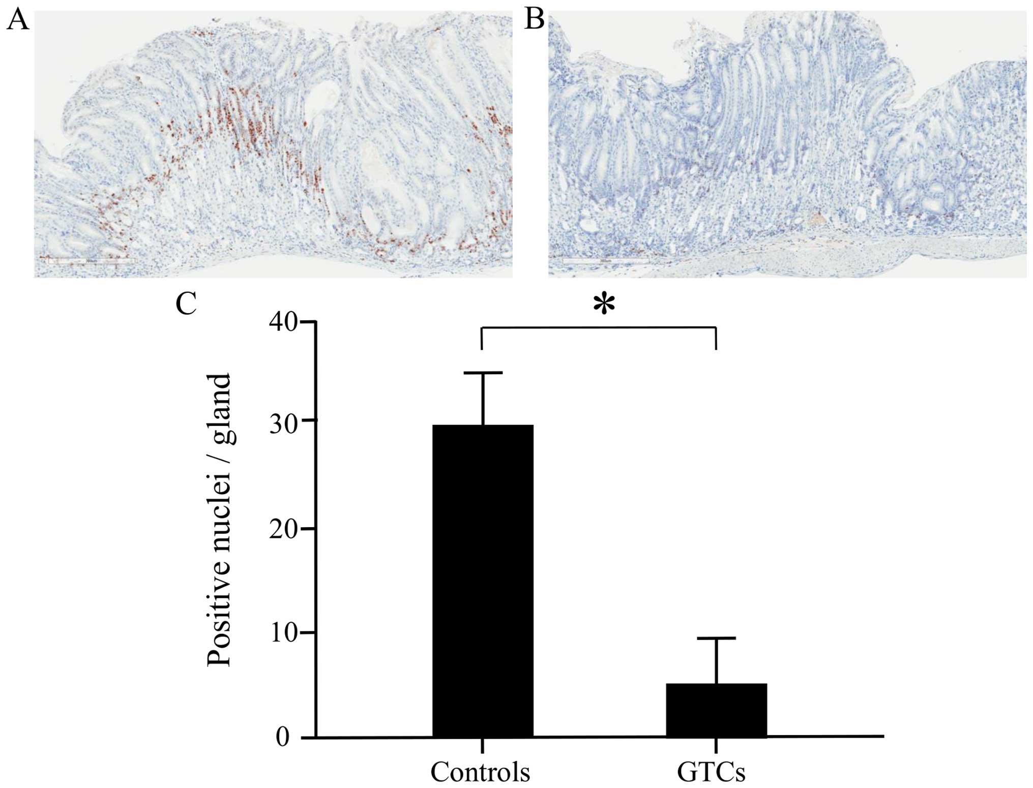 To evaluate the effect of GTC administration on cell proliferation in the gastric mucosal epithelium, analysis was performed in the 28-week administration cluster using the Ki-67 immunohistochemical staining labeling index. We observed Ki-67 positive nuclei from the glandular cervical region to the crypt epithelium (Fig. 4A and B). The labeling index of Ki-67 was significantly lower in the GTC-administered group than in the control group (Fig. 4C). This result suggested that cell growth in the gastric mucosal epithelium was inhibited by GTC administration.