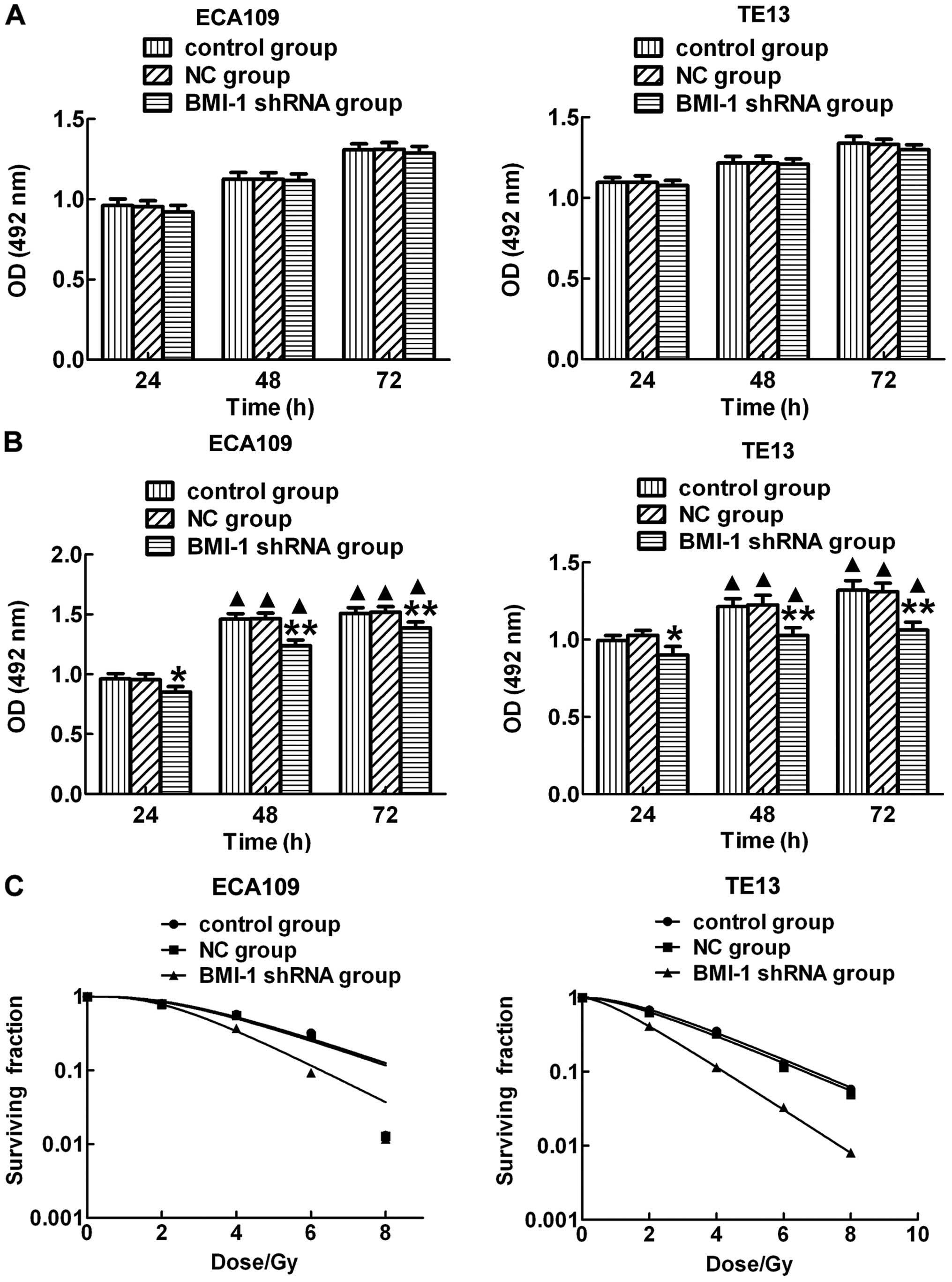 The human esophageal squamous cell carcinoma cell lines ECA109 and TE13 were cultured in RPMI-1640 medium supplemented with 10% fetal bovine serum (FBS) at 37°C in 5% CO2. The shRNA plasmid of BMI-1 was purchased from the GeneChem Co. ECA109 and TE13 cells were plated in 12-well plates at a density of 300 cells/well in triplicates, and plasmid multiplicity of infection (MOI) was 10. The cells were cultured in RPMI-1640 + 10% FBS with 5 µg/ml Polybrene for 12 h. Cells were collected 12 h after transduction with the plasmid and were selected in puromycin for stable clones. Subsequently, the cells were used for irradiation as indicated.