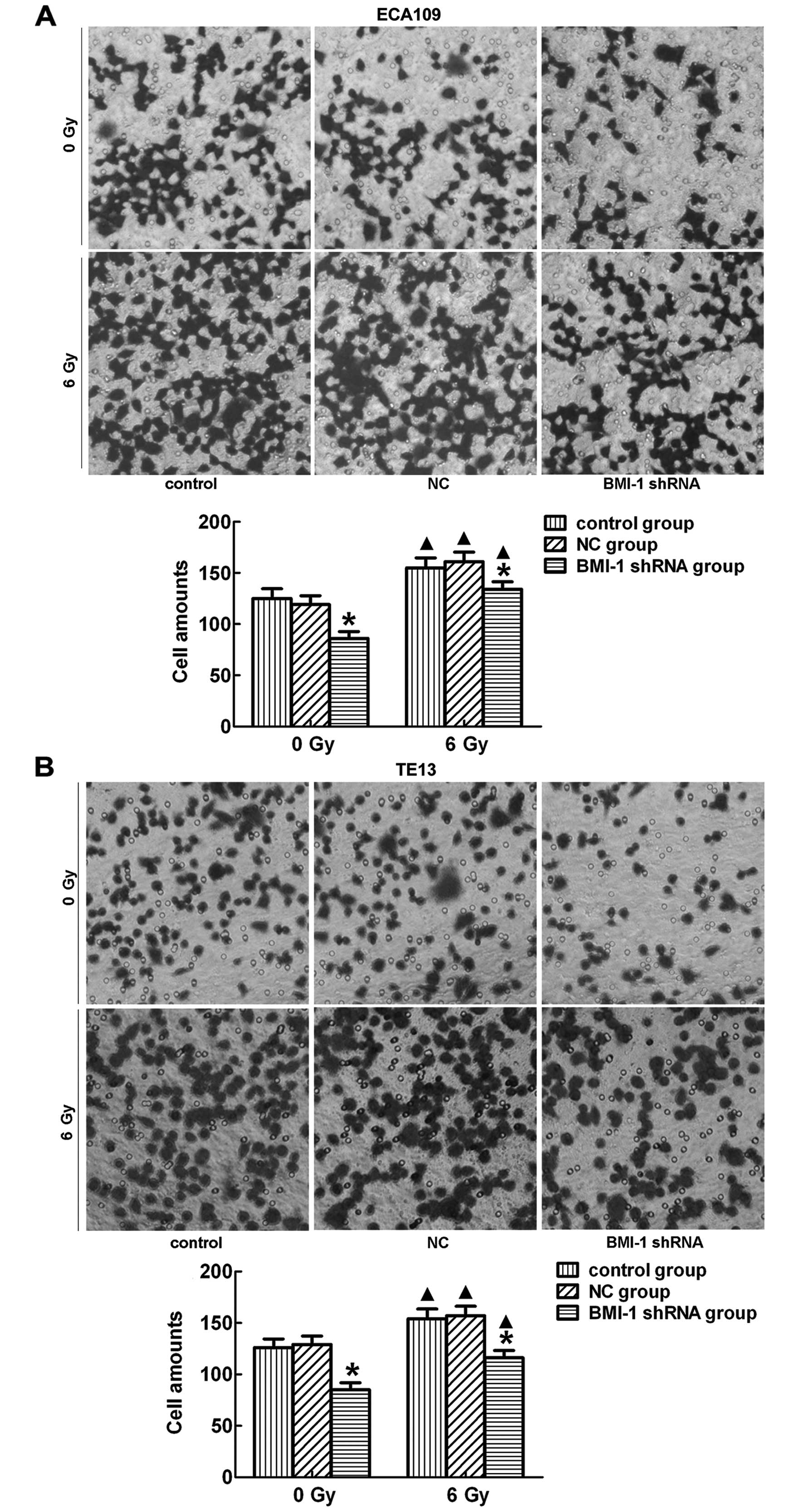 Transwell assay revealed that the ECA109 and TE13 cells transfected with BMI-1 shRNA had a much lower invasive activity than that noted in the control and NC group cells (p<0.05) before and after irradiation (Fig. 3A, ECA109; and B, TE13). This suggests that suppression of BMI-1 had an inhibitory effect on the invasion of cells. There was no significant difference between the control and NC group.